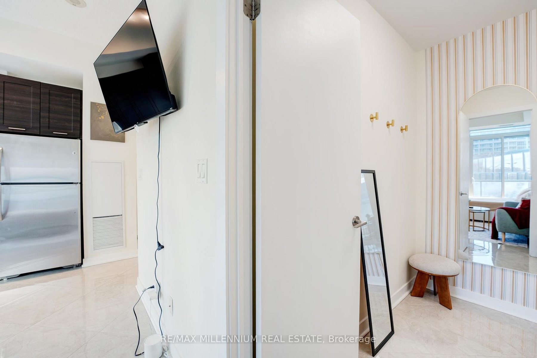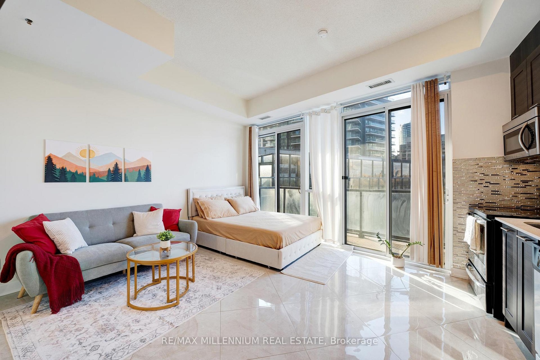 A Fully furnished Sun-filled, spacious, and cozy condo at Toronto's Lakeshore & Bathurst. Smooth 9'10" ceilings and floor-to-ceiling windows bring in beautiful light all day. The practical layout offers room for living, a comfortable sleeping area, and an eat-in kitchen.The kitchen features full-size stainless steel appliances, quartz countertops, an under-mount sink, and a custom backsplash. A rare multi-use walk-in closet (7'6" x 6'4"). Includes a 4-piece bathroom and two exits to a spacious balcony-perfect for fresh air and relaxing evenings.Well-managed building with great amenities: 24-hour concierge (secure deliveries), gym, party room, media room, rooftop terrace, BBQ patio, and visitor parking.Prime downtown location: walk to the Waterfront, streetcar, Rogers Centre, restaurants, bars, grocery stores, LCBO, banks, and more. Quick access to Billy Bishop Airport and Exhibition Place (CNE).A must-see home in an unbeatable location.The Unit will be rented with all the furniture currently in there.