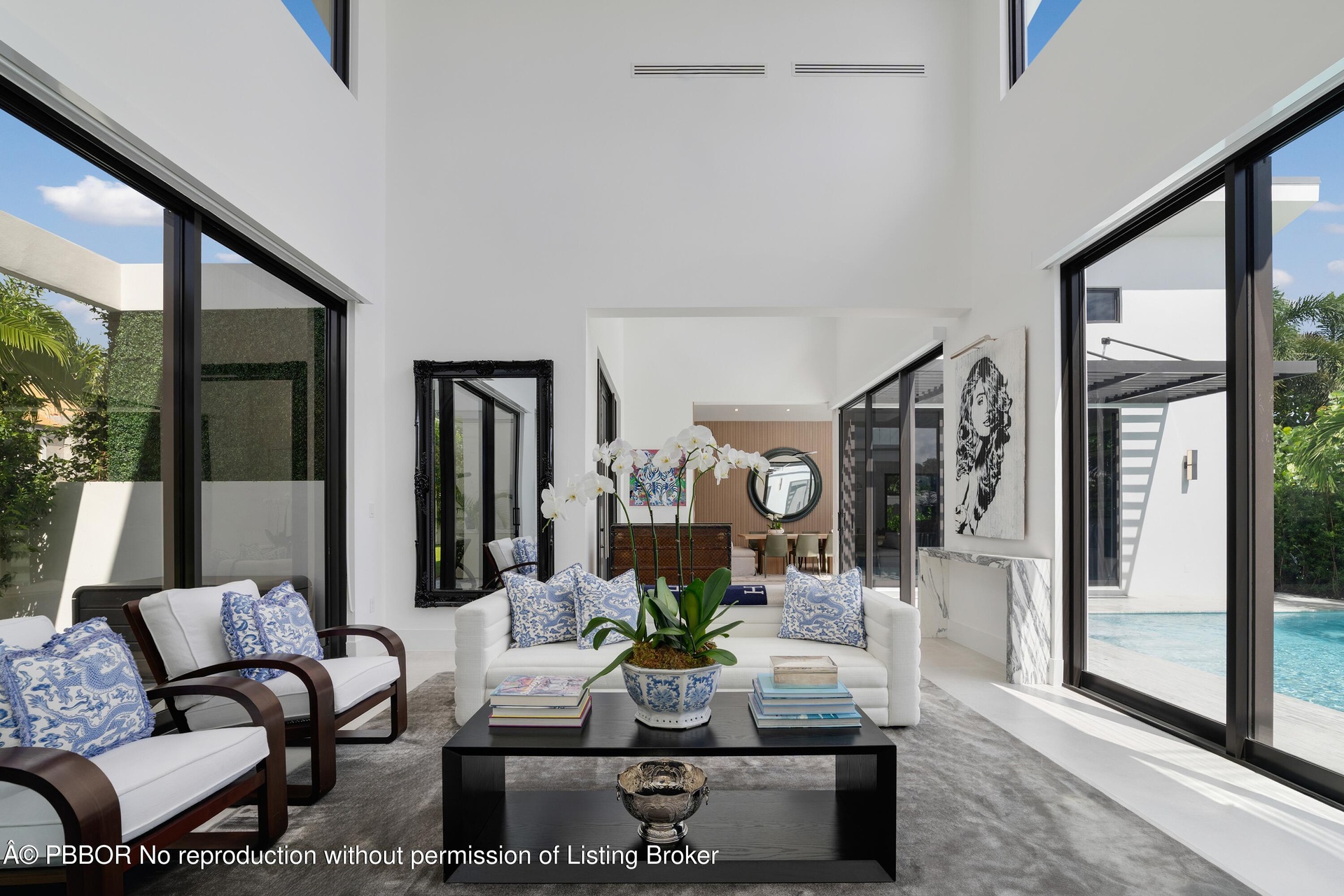 The main living areas are oriented around the pool, creating a natural connection between indoor and outdoor living. The living room features soaring ceilings and expansive sliding glass doors that open east to the pool and west to a terrace and lawn surrounded by mature trees and lush greenery. The kitchen, designed for both cooking and gathering, includes a large island, modern finishes, and a dining area overlooking the pool. Adjacent to the main living spaces, a media room serves as a relaxed extension of the homecomplete with a projector and drop-down screen, ideal for movie nights or informal entertaining.
