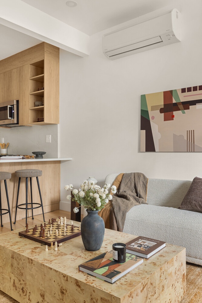 At the back of the residence are two well-proportioned bedrooms that both include custom closet systems. The large primary bedroom and en-suite bathroom are truly a sanctuary. Spanning nearly 13'x10', the room accommodates a king-sized bed as well as an array of other furniture and is effortlessly lit by south-east facing windows. The bathroom was designed with a contemporary look. A tasteful combination of neutral fluted and large format tiles cover the walls and floors boasting a subtle organic aesthetic. An oversized wooden vanity anchors this bathroom and provides ample storage space. The second bathroom is similarly outfitted and can be found adjacent to the second bedroom.
