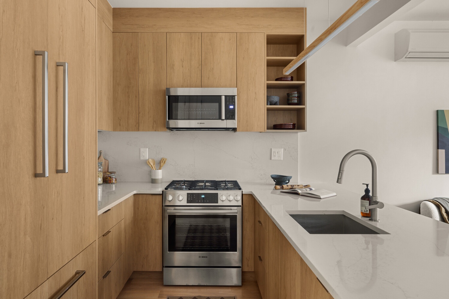 The kitchen is truly the pinnacle of this residence - showcasing oak toned cabinetry paired with sleek yet understated brushed nickel hardware adding a timeless touch to the cabinets, seamlessly complementing the kitchen fixtures. A lightly veined quartz was thoughtfully chosen, beautifully uniting the cabinetry's color palette. This chef's kitchen comes equipped with a Bosch appliance package including a 30" gas range, microwave, 30" double door refrigerator with bottom freezer drawer, and dishwasher.