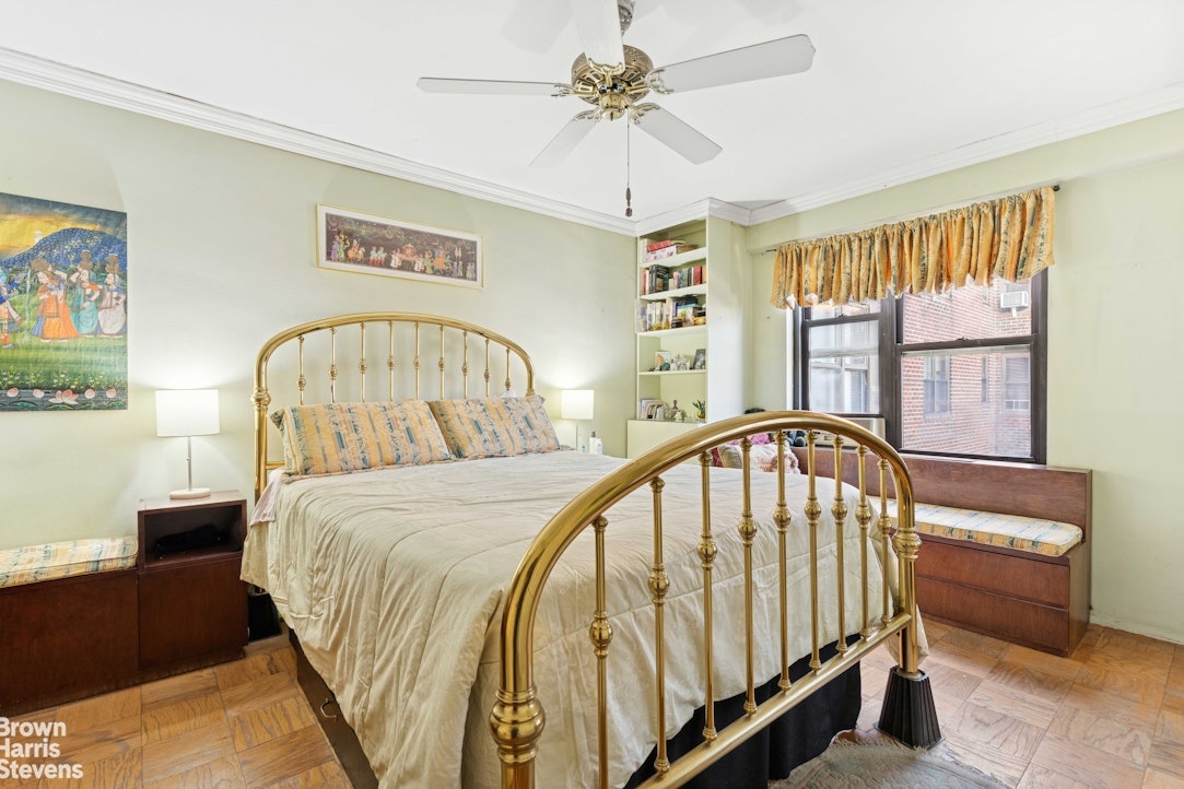 soothing marble tiling accented by a lovely mosaic tile border and features a huge walk-in shower with custom glass enclosure and a classic pedestal style sink. The generously proportioned bedroom can easily accommodate a king or queen size bed, offers three closets for excellent storage, and has two northeast facing windows with a custom window seat. Many other thoughtful features including custom built-ins, granite tile and crown molding. Dogs permitted with registration.