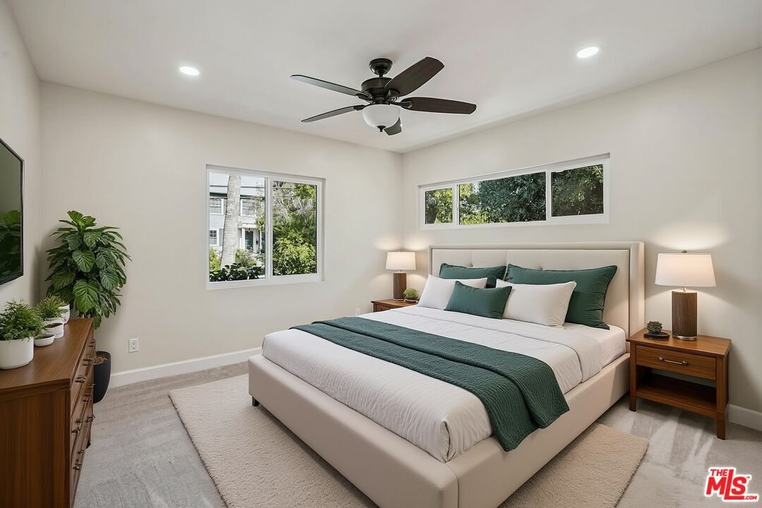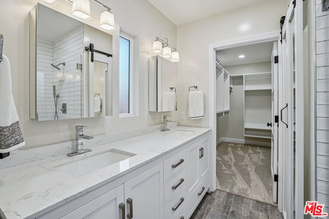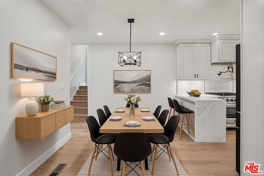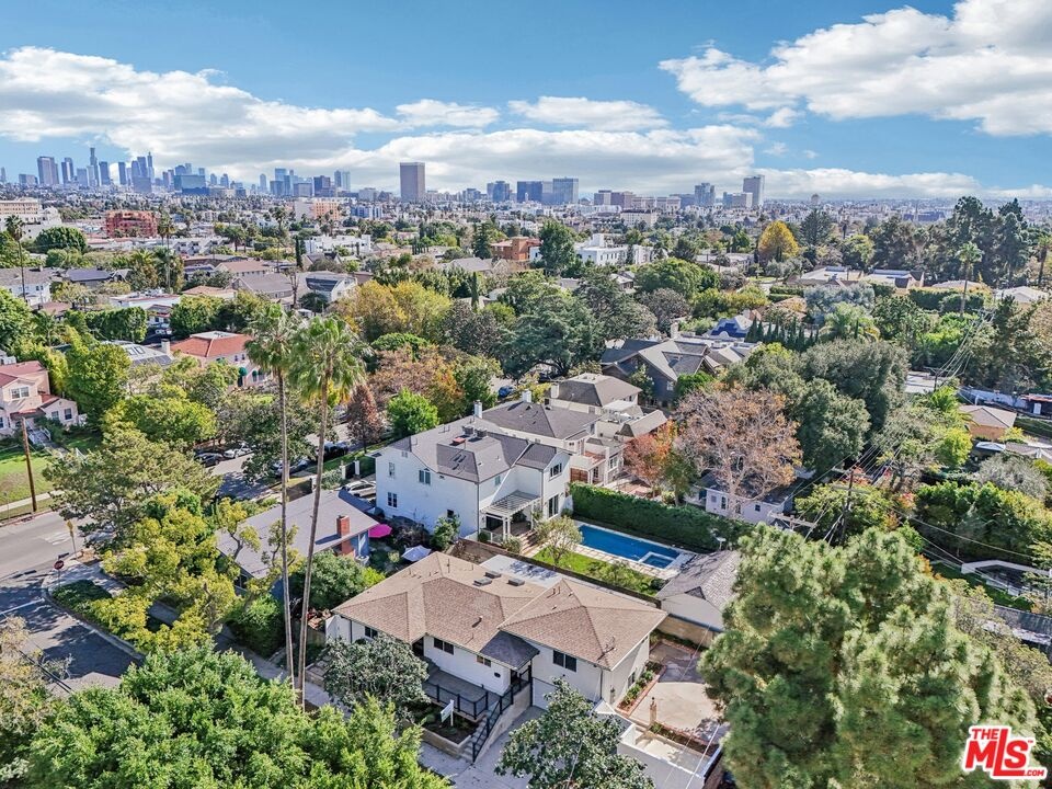 This beautifully renovated Larchmont residence blends contemporary elegance with timeless charm. Step inside through a new mahogany front door to a bright, airy living room featuring vaulted ceilings, recessed LED lighting, and white oak hardwood floors. The open layout flows into a custom chef's kitchen equipped with a Forno Capriasca 36" 6-burner range, custom range hood, quartz waterfall countertops, LED cabinet lighting, a Bosch panel-ready dishwasher, farmhouse sink, counter-depth 4-door refrigerator, decorative tile backsplash, brand-new cabinetry with crown molding, and a walk-in pantry.An inviting family/game room offers the perfect space for entertaining, complete with a custom bar, sink, dual beverage/wine refrigerators, skylights, and French doors leading to two outdoor patiosone covered with pavers and ceiling-fan lighting, the other a peaceful hardscaped retreat.The main-level primary suite features a custom walk-in closet and a spa-inspired bath with dual vanities, an oversized deco-tiled shower, and a mirrored barn door enclosing the private toilet area. Upstairs, two additional bedrooms include custom closets and share a thoughtfully designed bathroom with a dual-access vanity.Extensive upgrades include a new HVAC system and ducting, dual-pane windows, updated electrical and plumbing, custom lighting, skylights, redwood fencing, redwood decking with Trex railing, new garage door, and refreshed landscaping with LED lighting and drip irrigation.Ideally located near Larchmont Village with convenient access to Metro transit and major freeways.