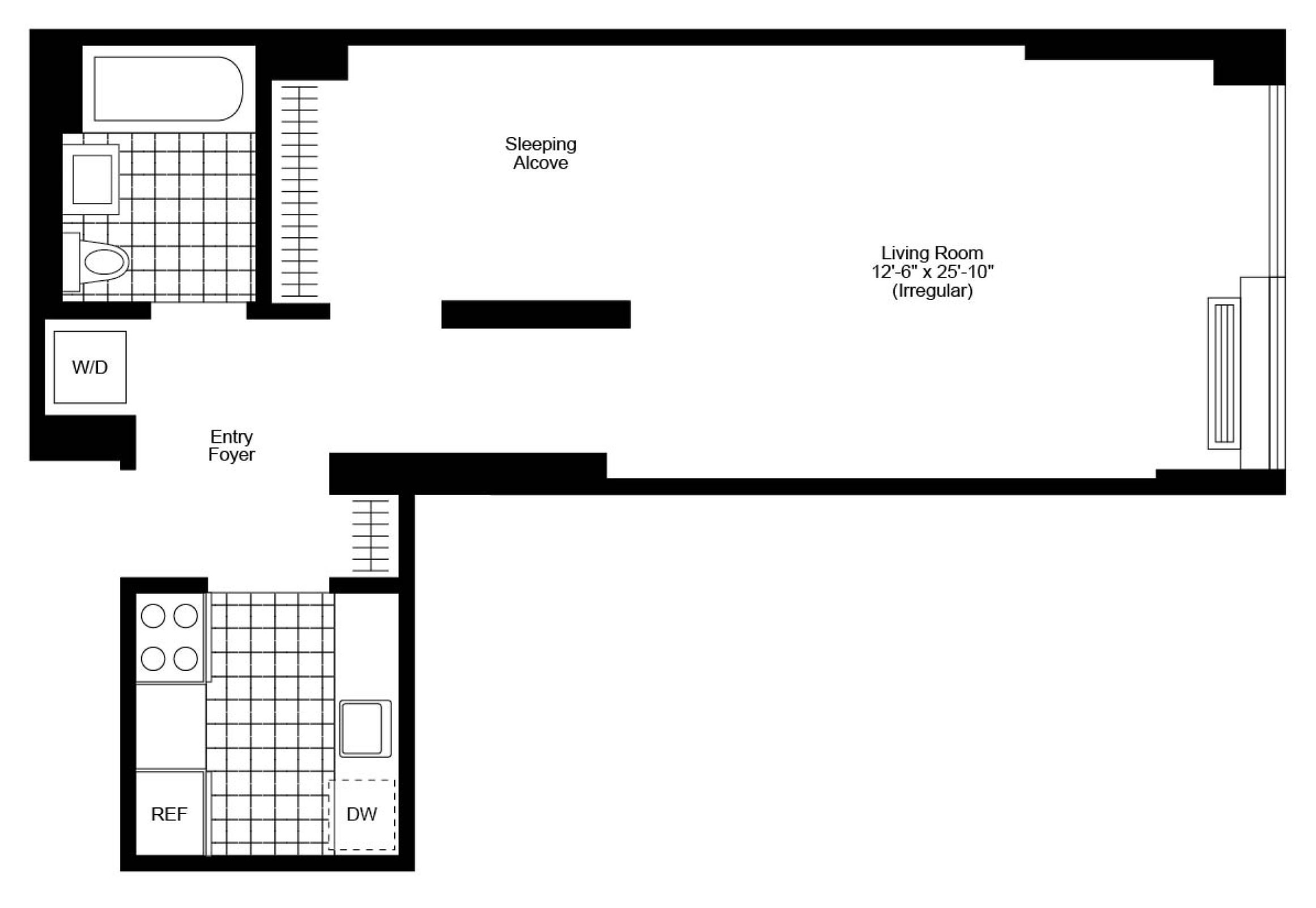 Spacious alcove studio with plenty of space for living and sleeping. Apartment features floor-to-ceiling windows, wood floors, an in-unit washer/dryer.
