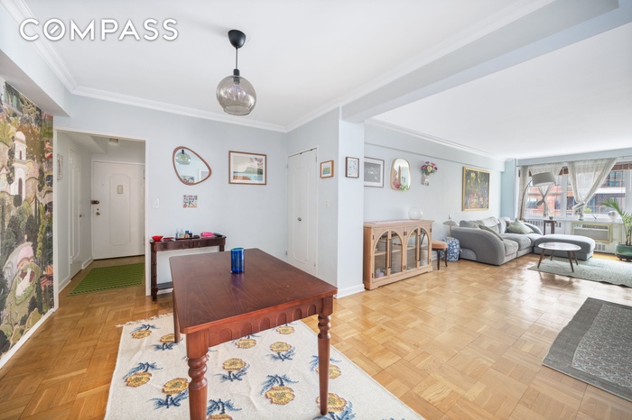 Welcome to Apartment 9R at 25 Sutton Place South—an oversized, beautifully appointed one-bedroom, one-and-a-half–bath residence offering exceptional comfort and style. A gracious entry foyer with a powder room leads into an expansive living room, perfect for both entertaining and relaxing. The large, windowed kitchen features extensive counter space and abundant cabinetry, while the spacious bedroom offers excellent closet space. Beautiful wood floors flow throughout the home, enhancing its warm and sophisticated character.