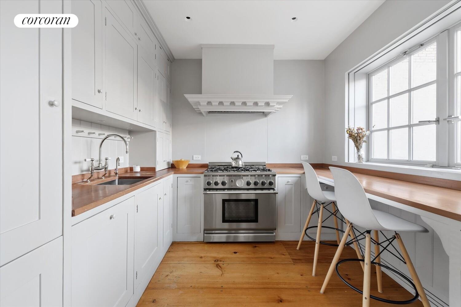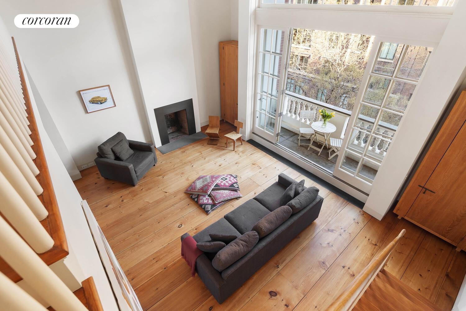At the heart of the residence stands the great room, a voluminous living and entertaining space defined by 17-foot ceilings and expansive north- and south-facing windows. A wood-burning fireplace anchors the room, while French doors open to a terrace with iconic Empire State Building views. The custom Shaker-style eat-in kitchen on the main level integrates fine cabinetry and artisanal materials with exceptional craftsmanship.