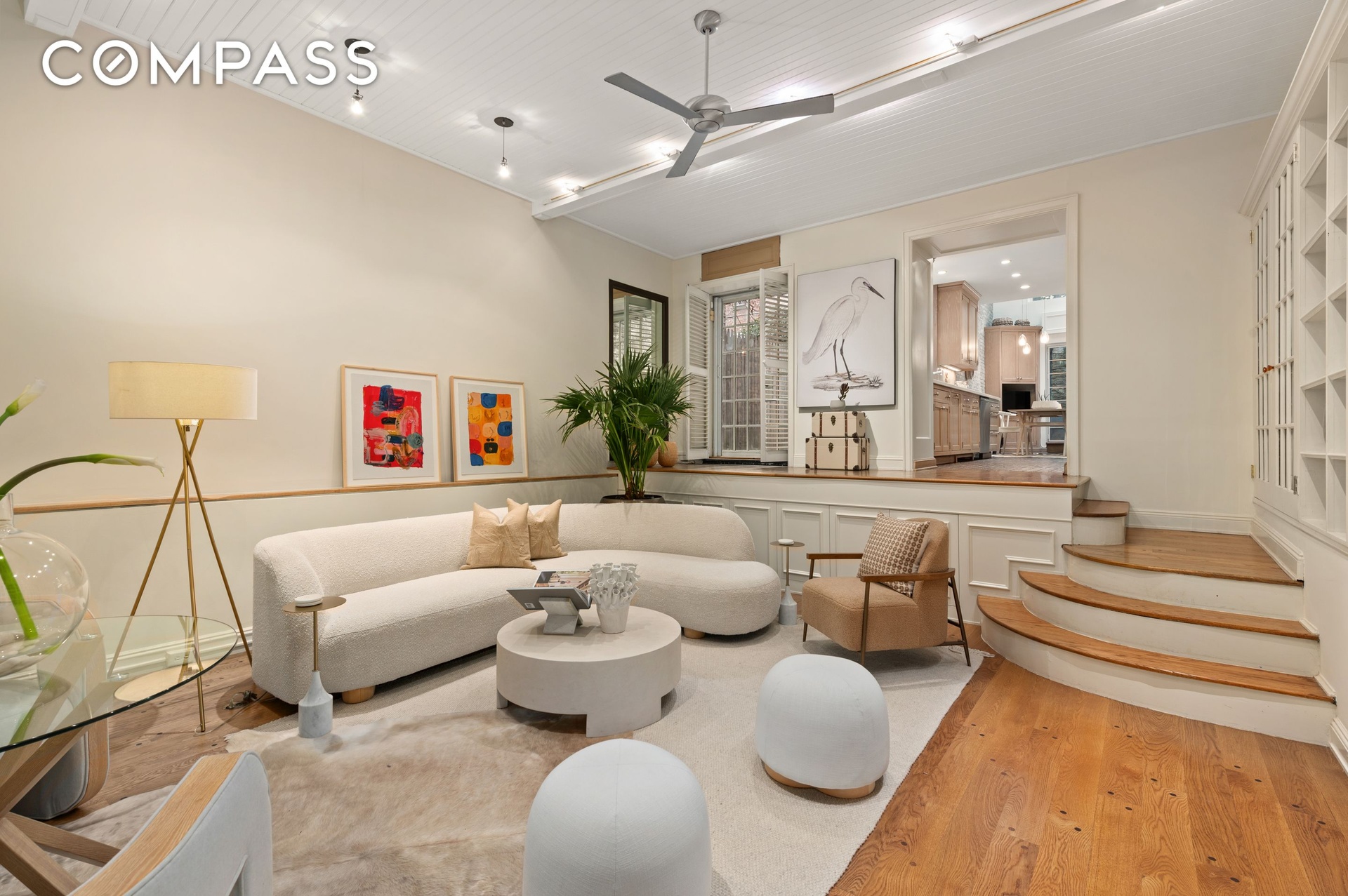Ascending to the parlor floor, discover the home’s gracious formal living room, a guest bedroom with full en-suite bath, and a luminous solarium-style office. Sunlight pours through the office’s east-facing casement window and glass-beamed ceiling, creating an inspiring space for work or relaxation. The adjoining living room impresses with its soaring ceilings, a handsome fireplace, a sweeping, south-facing window, and a distinguished wall of built-ins that convey effortless elegance.