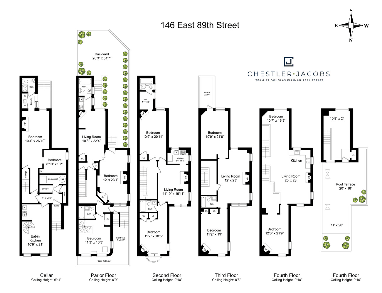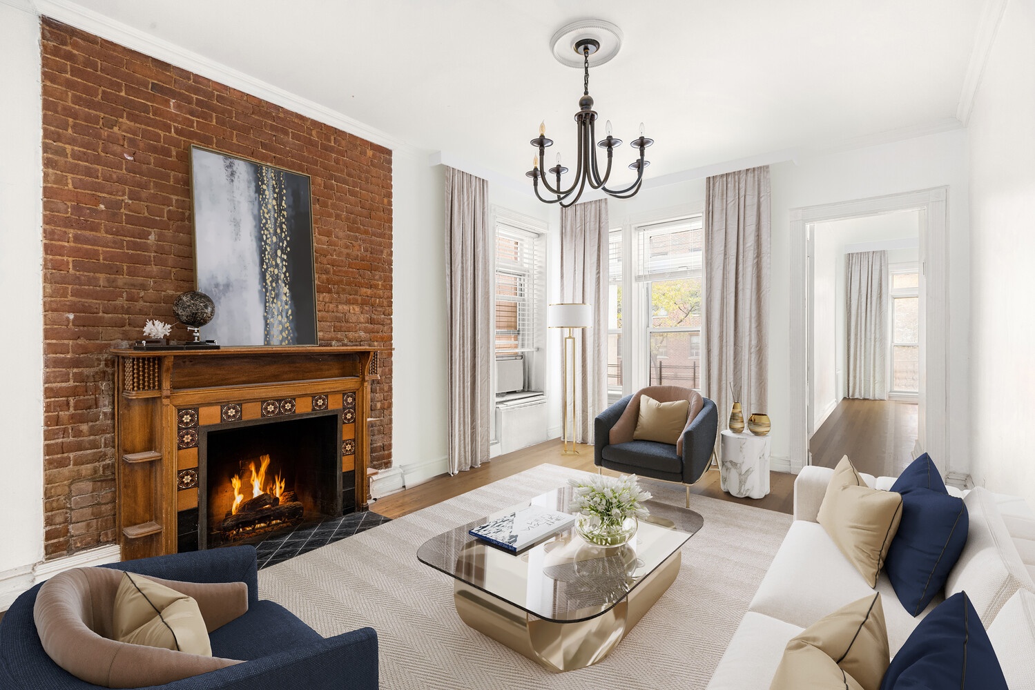 Measuring approximately 20 feet across at its widest point, the home is arranged over four expansive floors plus a full-height basement. Outdoor areas include a sunny south-facing garden, a second-floor balcony, a third-floor terrace, and a roof deck of roughly 380 square feet. Original elements, such as a gracious staircase, fireplaces, and exposed brick remain in place, offering the potential to blend historic character with modern finishes. As an end-unit townhouse, the residence enjoys exceptional natural light from three exposures. A gated front entry and elevated stoop create a striking street presence.