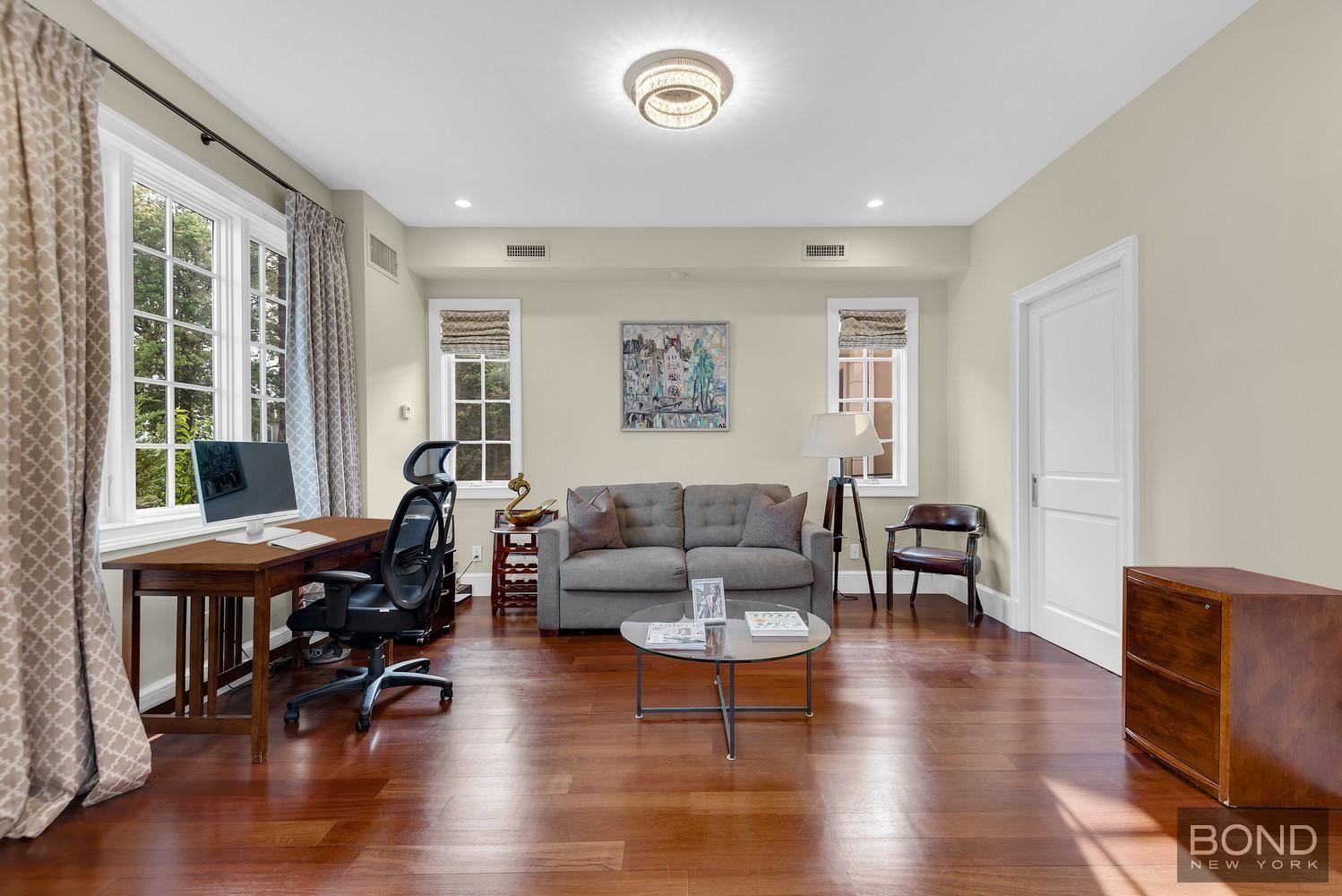 The second level offers three spacious bedrooms, including a serene primary suite designed to feel like a personal retreat. The main hall bath is ADA-accessible for added convenience. The oversized primary bedroom is complemented by an extraordinary walk-in closetlarge enough to function as a dressing room or private officeand a spa-inspired ensuite featuring radiant heated floors, a double-wide vanity, a luxurious whirlpool tub, and rainfall shower. This level continues the homes airy elegance with 10-foot ceilings throughout.