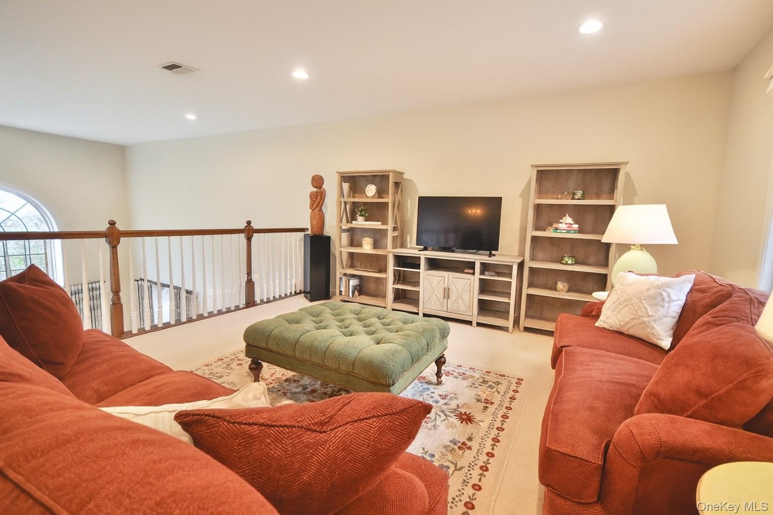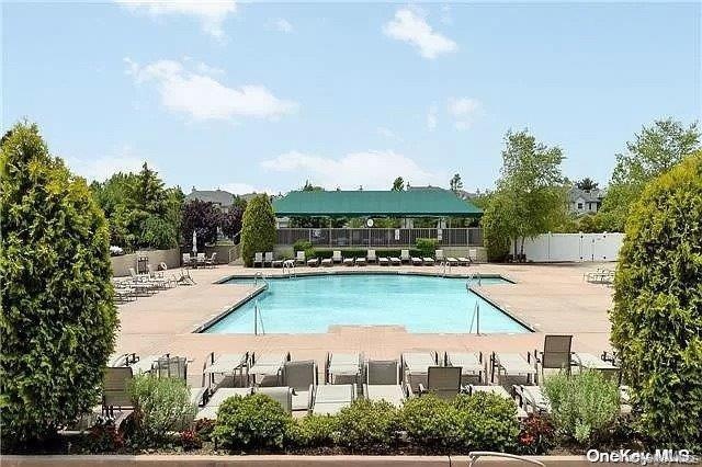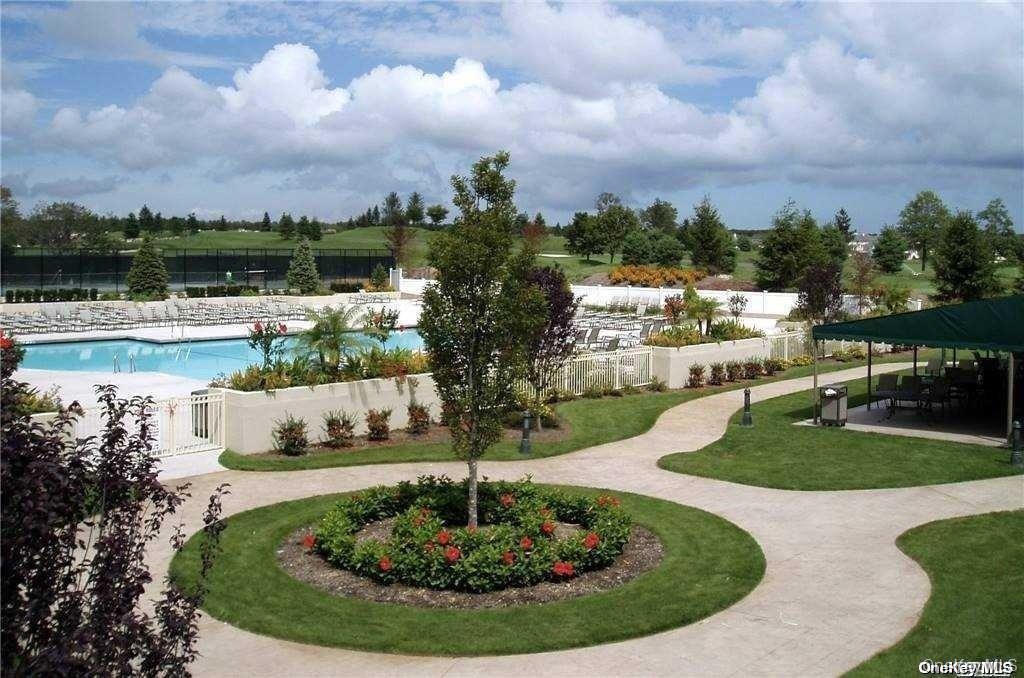 Beautifully maintained and updated 2-bedroom, 2.5-bath Medici model with main-level primary suite in The Greens at Half Hollow. Prime cul-de-sac location with convenient parking and private patio yard. Features include a dramatic two-story entry, vaulted living room with wood floors, and an eat-in kitchen with gas cooking, new microwave and stove/oven range, peninsula seating, updated countertops, stainless steel appliances, and an oversized pantry. The main-level primary suite offers two custom closets and a spa-like bath with soaking tub, shower, and double vanity, plus full-size washer/dryer. A powder room completes the first floor. The second level features a versatile loft with new plush carpet, a guest bedroom, and a full bath. Additional highlights include abundant natural light, brick patio, and an attached 1-car garage. Enjoy 24-hour security and resort-style amenities including indoor/outdoor pools, fitness center, spa, tennis, clubhouse with dining, card rooms, library, numerous activities, and optional golf membership.