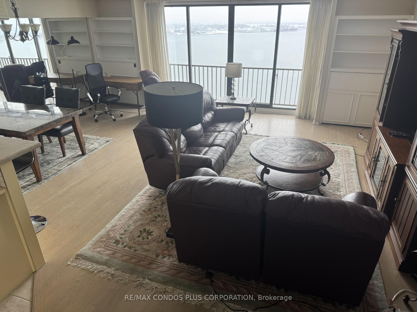 Executive Furnished two bedroom + 2 bathrooms,parking, approx 1450 sq ft with beautiful views of harbour and lake ontario.Hardwood floors throughout,Building has private shuttle bus service for residents,indoor salt water pool + sauna,gym and weight room,guest suites,concierge desk and security guards,lots of visitor prk,library,car wash,hobby room,party room++Rental amount includes hydro,cable + internet.