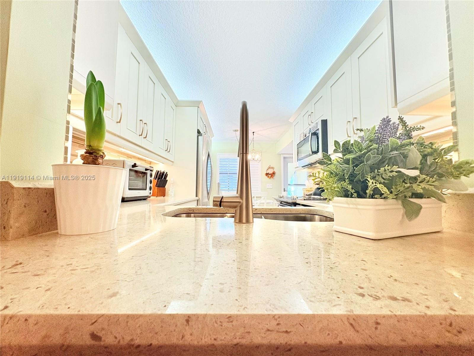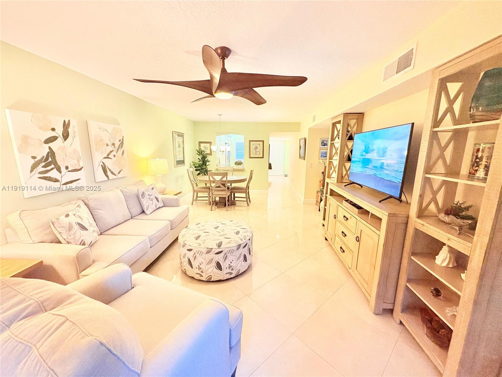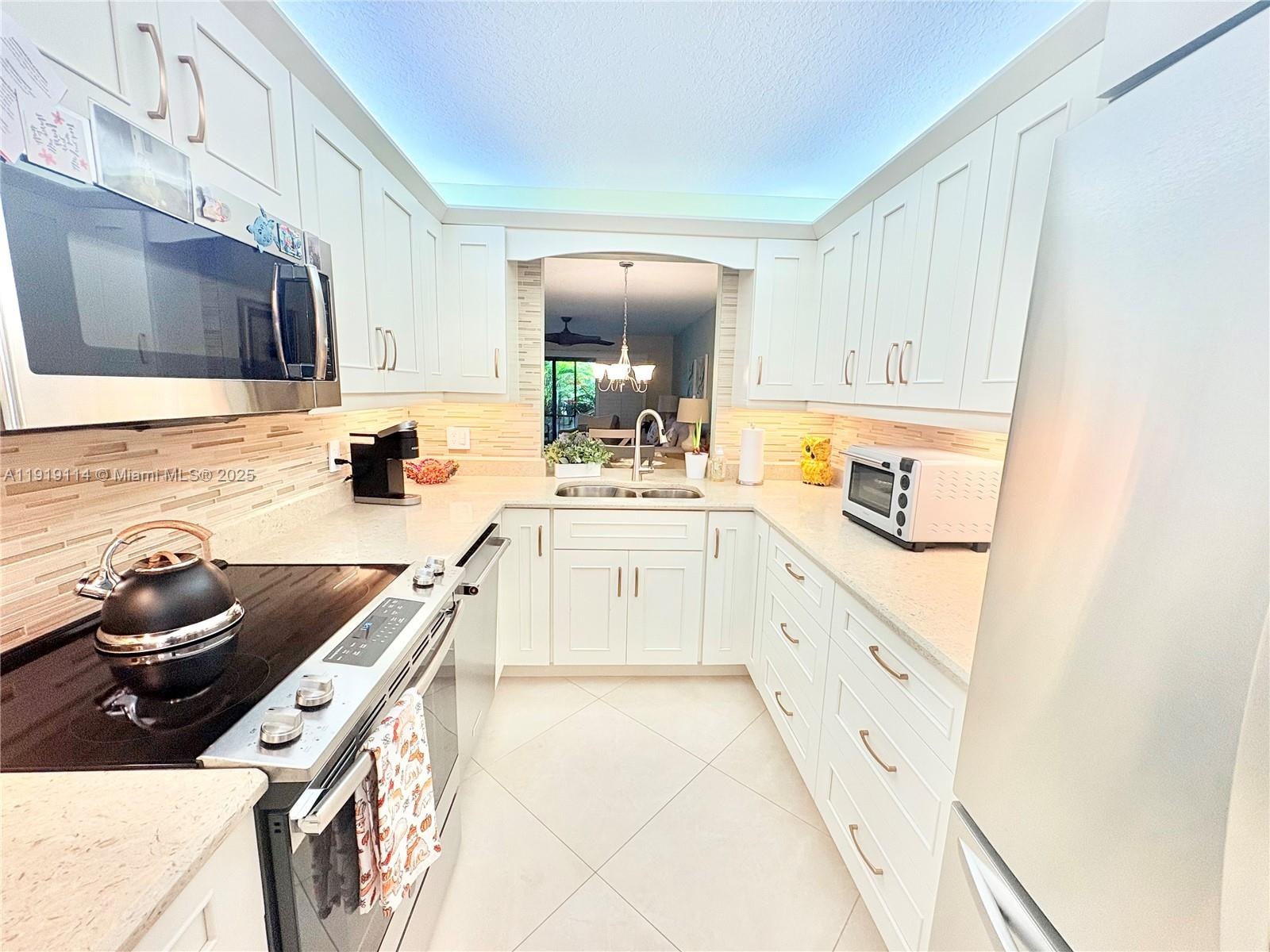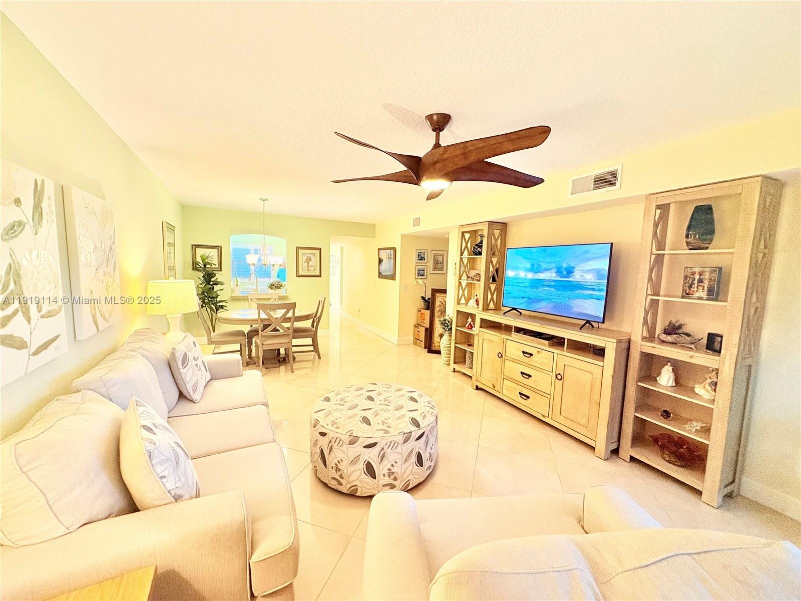 Dripping in luxury from top to bottom! Expanded chef's kitchen features quartz countertops, Elkay sink, Moen fixtures, stainless steel appliances, upgraded lighting, and above-cabinet ambiance lighting. Bathrooms are fully elevated with quartz, floor-to-ceiling designer tile, upgraded hardware, and one-piece Kohler toilets. Primary suite includes an expanded walk-in dressing room with designer shelving and full-size washer/dryer. Imported Italian porcelain tile runs seamlessly from the main living area to the screened lanai, showcasing your beautiful golf course view; Karastan carpet in bedrooms adds comfort and warmth. Plantation shutters throughout and uograded closet doors complete the look. New A/C (2024) and brand new impact windows and sliders (2025) for superior protection and insurance savings. Easy to show - text/call listing agent. All measurements approximate, buyer to verify. HOA application required.
