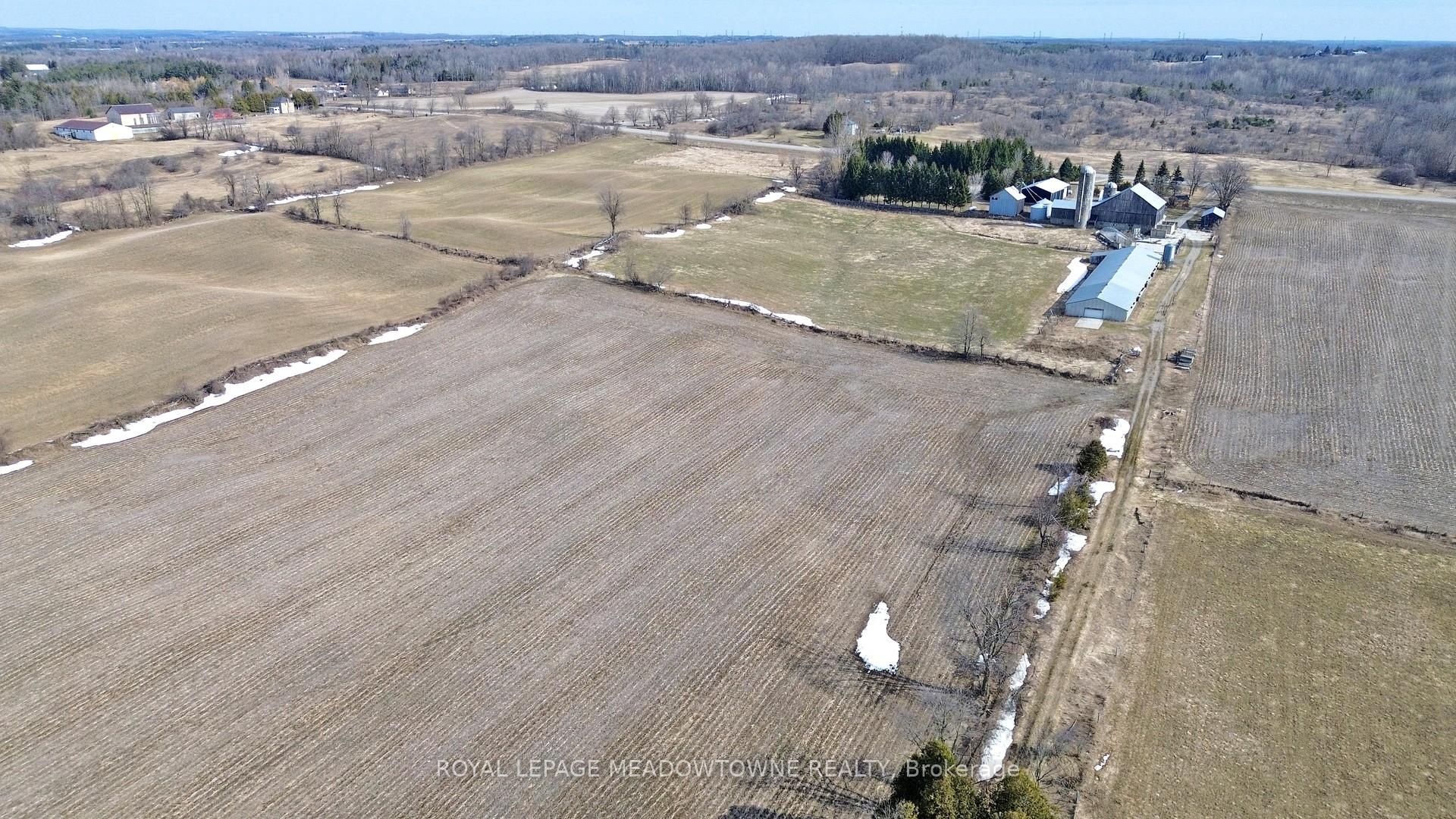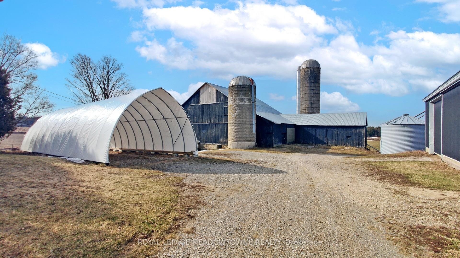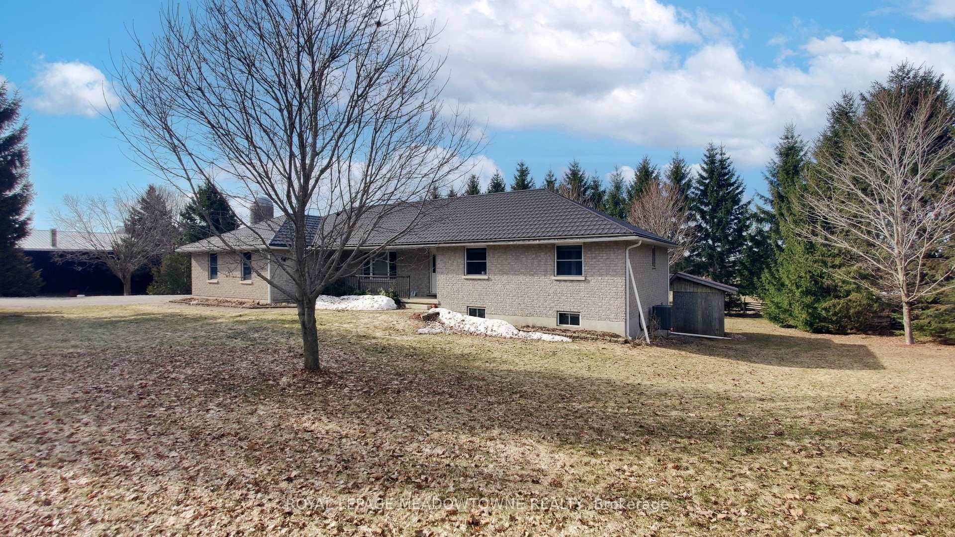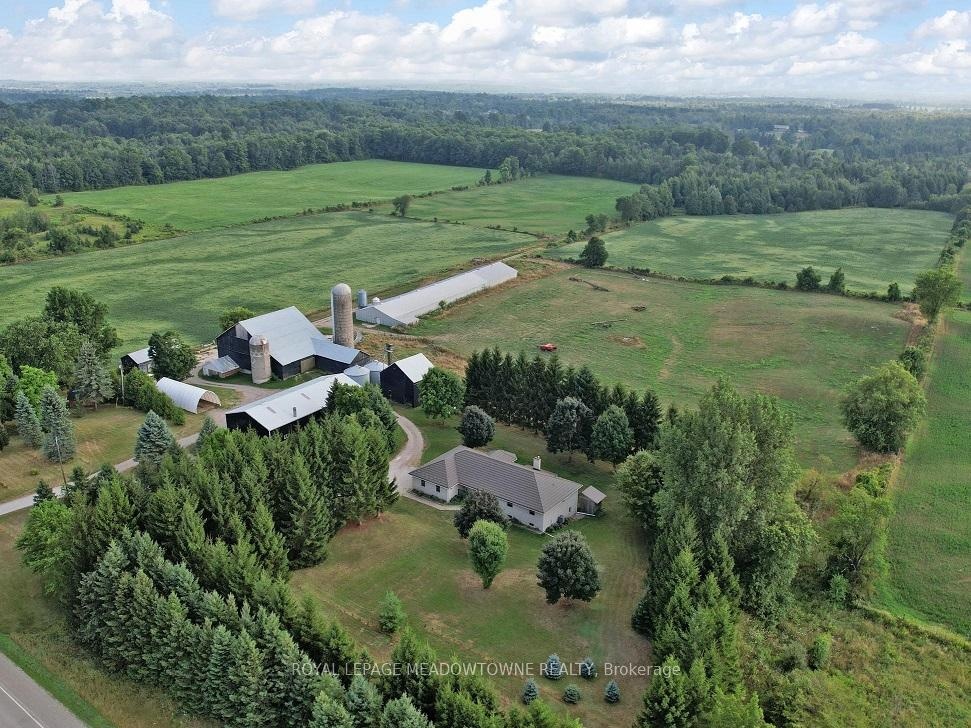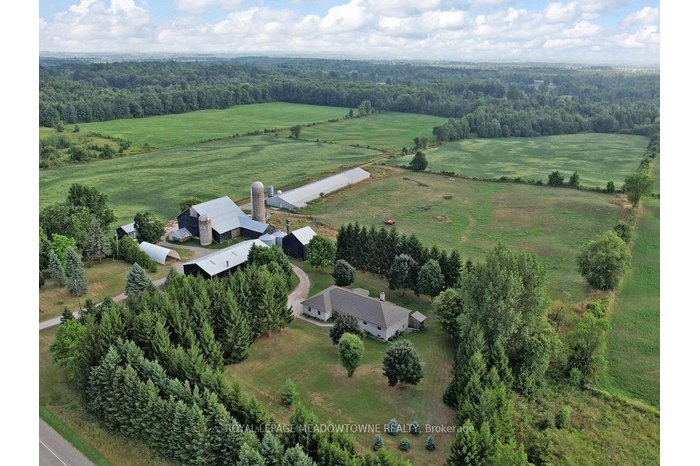 After five generations, this 98.89-acre farm is ready for its next family. Enjoy peaceful country living on a paved road with school bus service, just minutes to town and GO Transit. A rare opportunity to blend lifestyle, income, and farming. The 2001 custom-built brick and stone bungalow set well back and private from the road, provides 4,600 sq ft of living space with a walk-out lower level, ideally suited for a family, multi-generational use, a home-based business or renting. Main floor features a bright eat-in kitchen with centre island and walk-out to deck, formal dining room with pocket doors, open-concept great room, and spacious primary bedroom with ensuite and walk-in closet. Plus a convenient access to the attached 2 car garage and main floor laundry. The lower level includes a 2nd kitchen, 3-pc bath, 2nd laundry, private garage entry and an open concept living area with walk-out to a covered patio area which is perfect for in-law suite or income potential. Many updates include furnace and A/C (2024) and metal roof (2014). Plus 40 acres in workable land for cash crops, 25+ acres in grass for hay, plus a mature mixed forest with maple trees for syrup and private trails for walking, riding and ATV use. Extensive outbuildings include 48' x 288' former poultry broiler barn with heat and concrete flooring, 3,900+ sq ft majestic bank barn with stables for small animals and clean loft, and 40' x 80' drive shed with a concrete floor heated workshop and storage, silos and feed bins for farming, storage and income uses. Two entrances off the paved road give you flexibility for farm equipment access to the outbuildings from the house. Possible lot severance might be available (buyer to verify). The current OFA tax credits may not apply and the land is subject to HST. Two drilled wells serve the farm and house separately. Located in the Town of Erin with an Acton address, close to Acton shops and GO station, Georgetown, Guelph, Milton, and Rockwood.