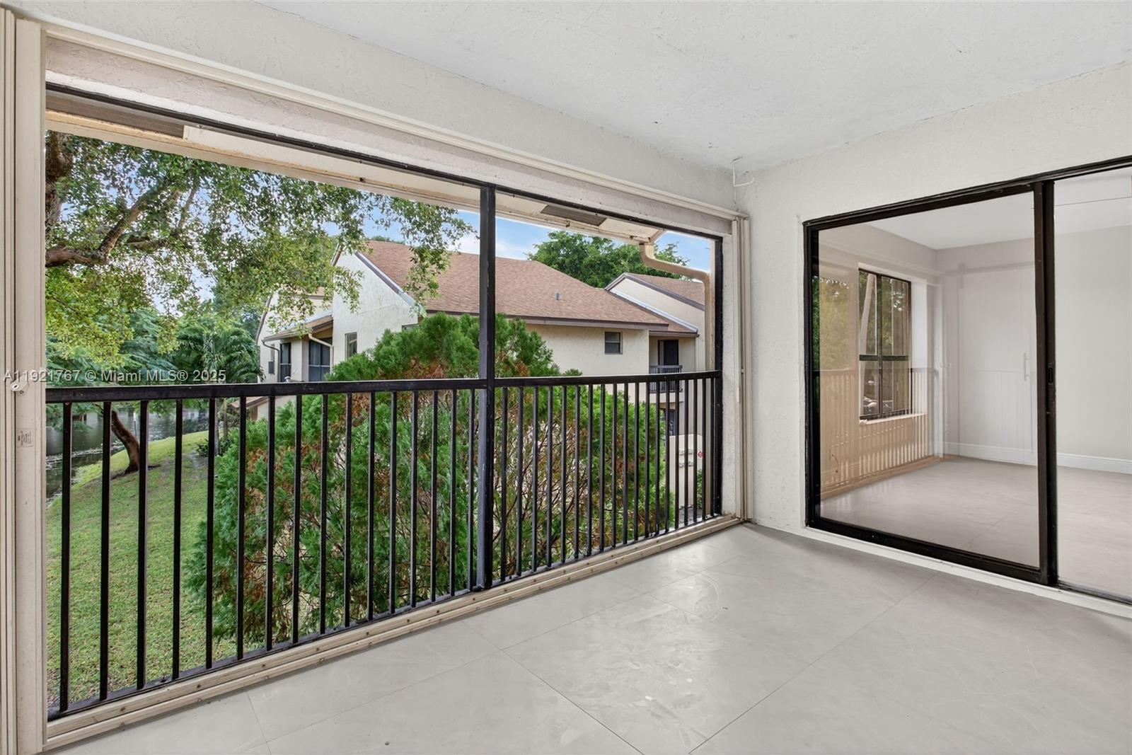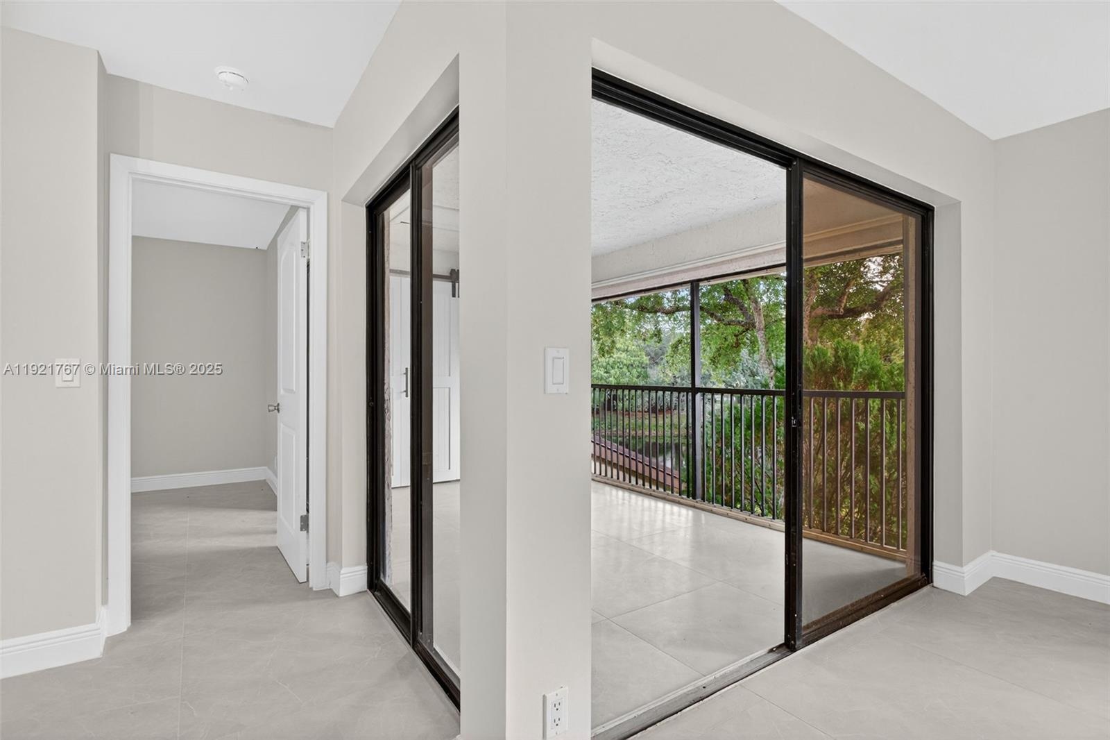 Spacious open living/dining area with contemporary lighting and black-framed sliders that open to an extended screened balcony/lanai—matching tile, private treetop/water views, and a unique barn-door laundry closet with Samsung front-load set + utility sink.