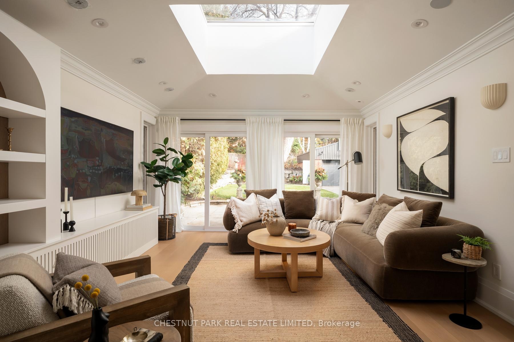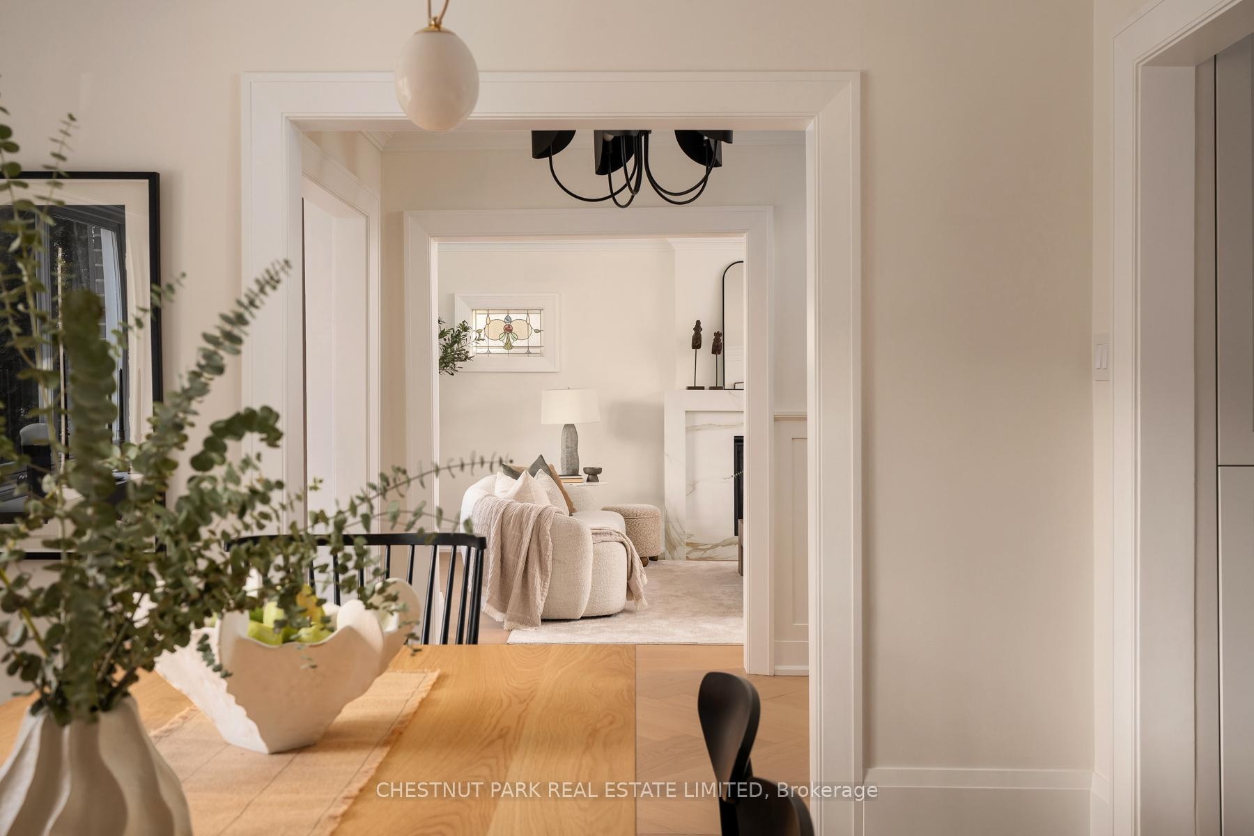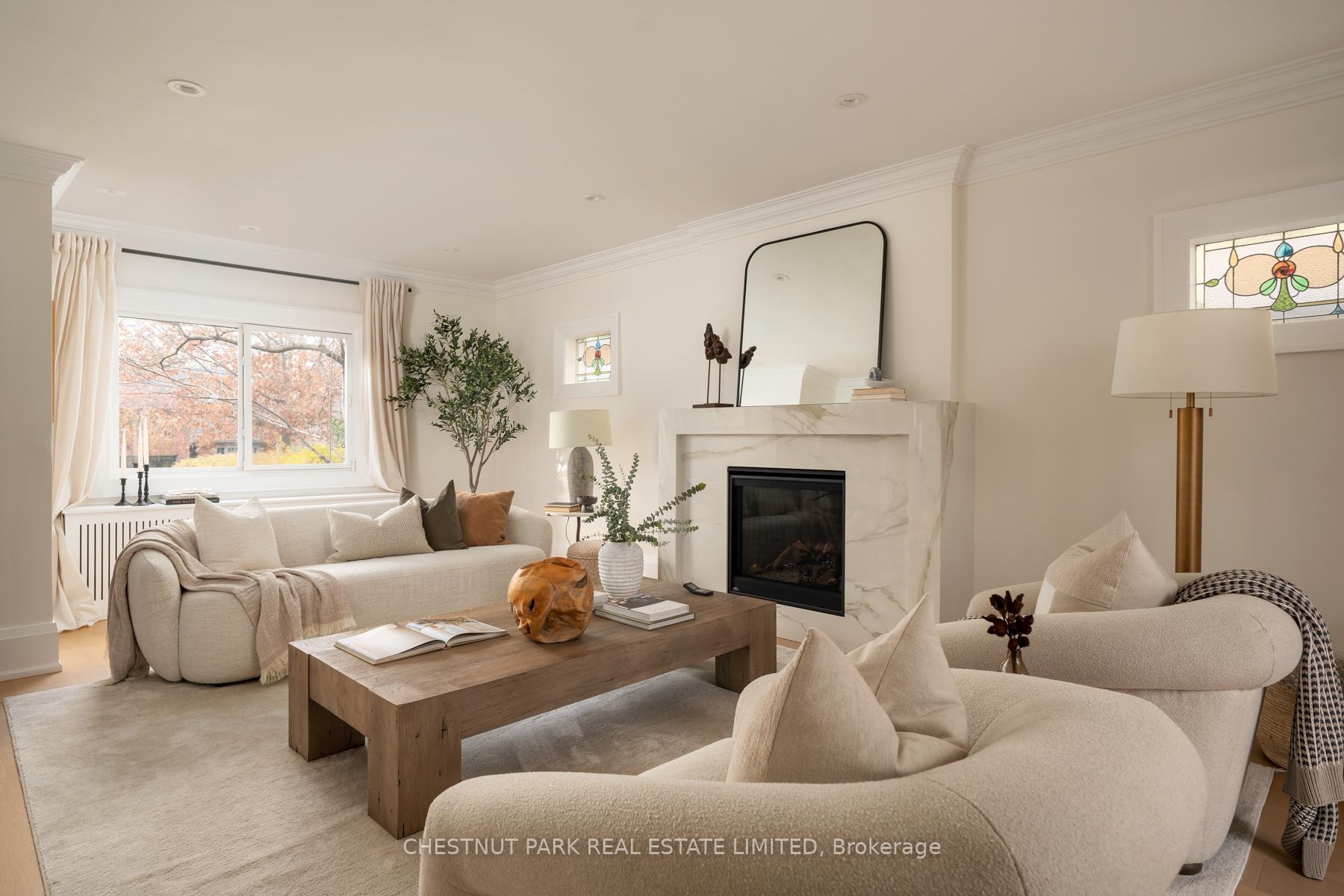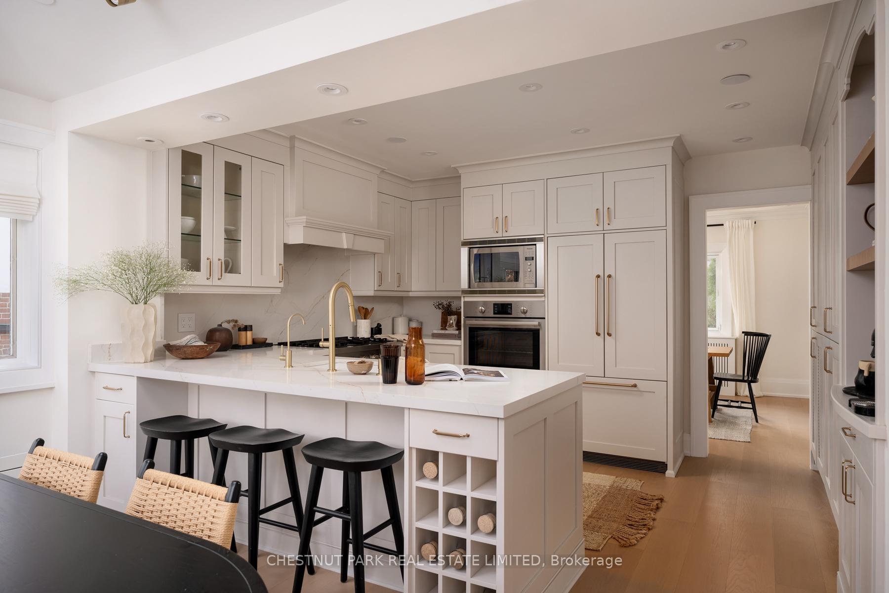On the most coveted stretch of Weybourne Crescent, stands this Georgian home that feels lifted straight from the pages of Architectural Digest. Its presence is unmistakable: a manicured front garden frames the warm brick façade, enriched by symmetry, a detailed portico, a solid wood centre-hall door with glass inlays, and charming dormers that give the home its elegant, inviting personality. Inside, the story unfolds with a foyer finished in heated natural stone, a panelled oak-wood closet, and a skylight that fills the space with natural light. To the right, the formal dining room glows beneath a designer chandelier and flows seamlessly into the sun-filled kitchen with brand new panelled Fridge/Freezer, Dishwasher and built in oven, where refined finishes and a window-wrapped breakfast nook overlook the private backyard. Across the centre hall, the living room offers timeless charm with a gas fireplace, opening into a designer family room featuring a custom media wall, arched built-in, a dramatic skylight, and floor-to-ceiling windows framing the backyard oasis. Engineered white oak floors, pot lights, and integrated speakers elevate the entire main level. The second floor hosts a serene primary suite with a 5PC ensuite and walk-in closet, along with 2 additional bedrooms and a laundry closet. The third floor has two bright bedrooms with built-ins, adding rare architectural character. The lower level extends the home with two versatile rooms, a modern bath, a large laundry room, and a spotless utility space. Outdoor living shines with landscape lighting, smart irrigation, outdoor speakers, and rare parking for up to 9 cars, including a 2-car detached garage behind a remote-controlled gate. Steps to parks, the Lawrence Park Tennis Club, and close to Granite Club & Rosedale Golf Club, an easy walk to Yonge Street, Subway Station, and top schools, this home offers a lifestyle of charm, character, and modern family luxury on one of Toronto's most admired streets.