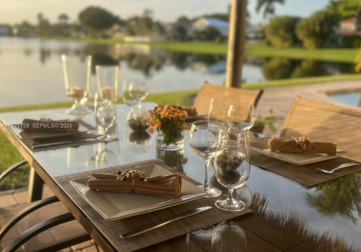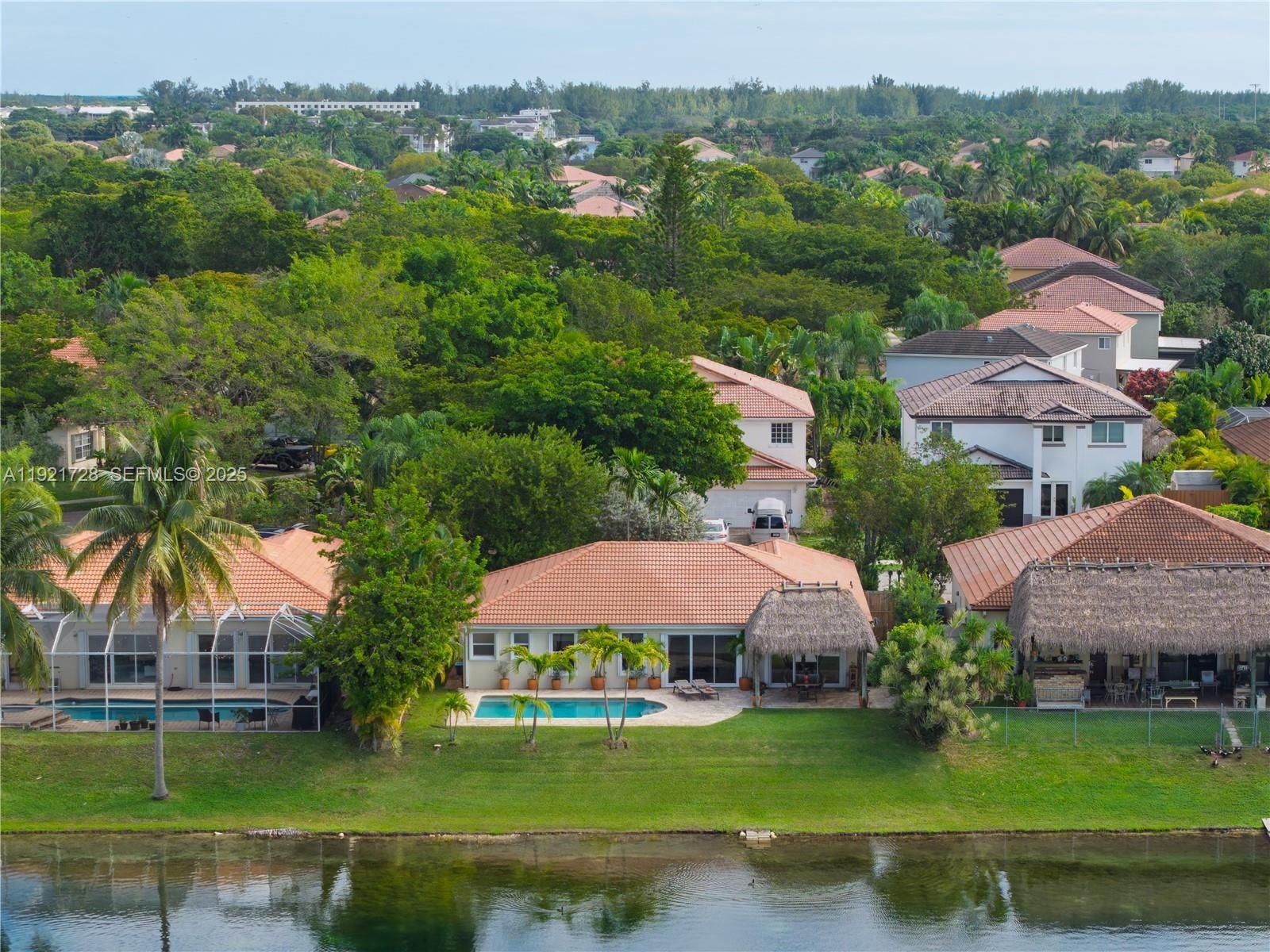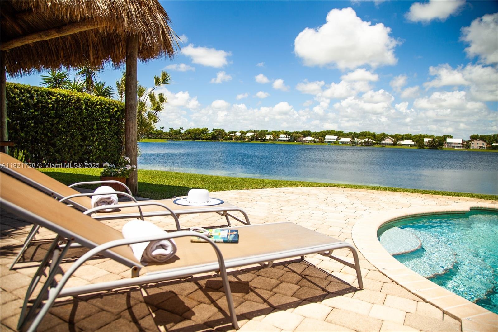 Lakefront pool home offering a calm, open layout and unobstructed water views from the main living areas and primary suite. Bright interiors, natural tones, and wood accents create a warm atmosphere. The backyard is an entertainer's dream, featuring a covered tiki area with fan. A portable gas grill and griddle is included for outdoor dining. House features 3 bedrooms + office/flex room, 2 bathrooms, impact protection (accordion and/or impact windows), salt-system pool, sprinkler with well, smart alarm, remote lock, auto-on lights, camera system.