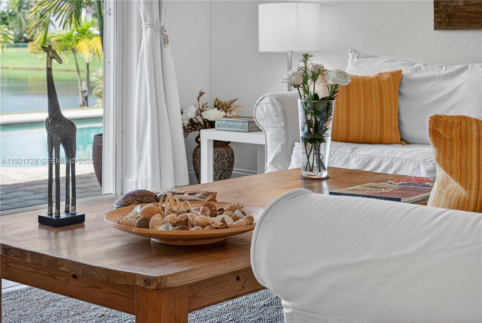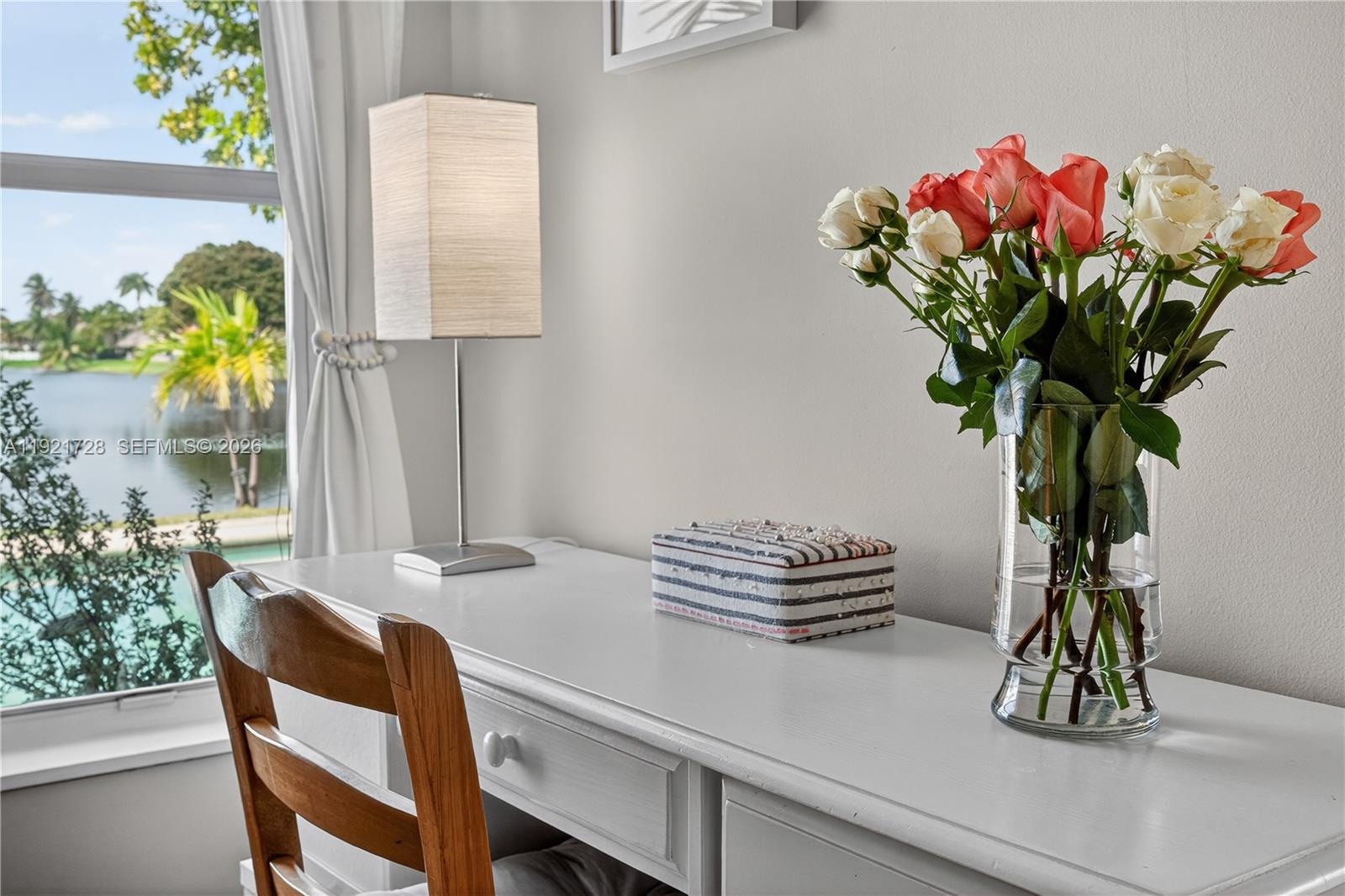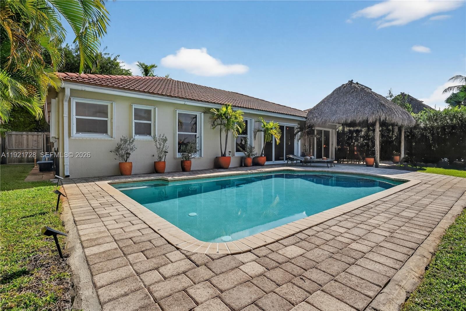 Lakefront pool home offering a calm, open layout and unobstructed water views from the main living areas and primary suite. Bright interiors, natural tones, and wood accents create a warm atmosphere. The backyard is an entertainer's dream, featuring a covered tiki area with fan. A portable gas grill and griddle is included for outdoor dining. House features 3 bedrooms + office/flex room, 2 bathrooms, impact protection (accordion and/or impact windows), salt-system pool, sprinkler with well, smart alarm, remote lock, auto-on lights, camera system.
