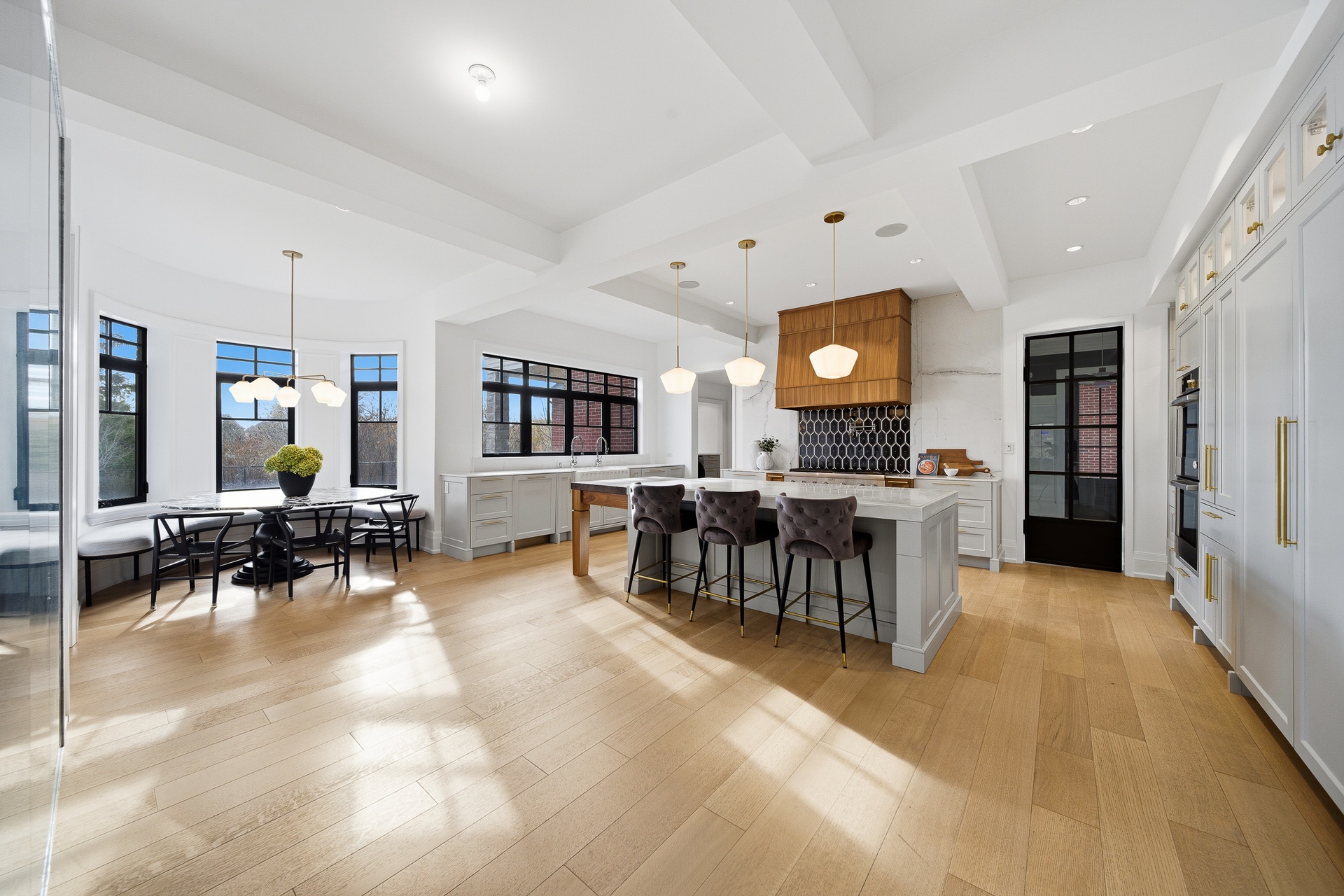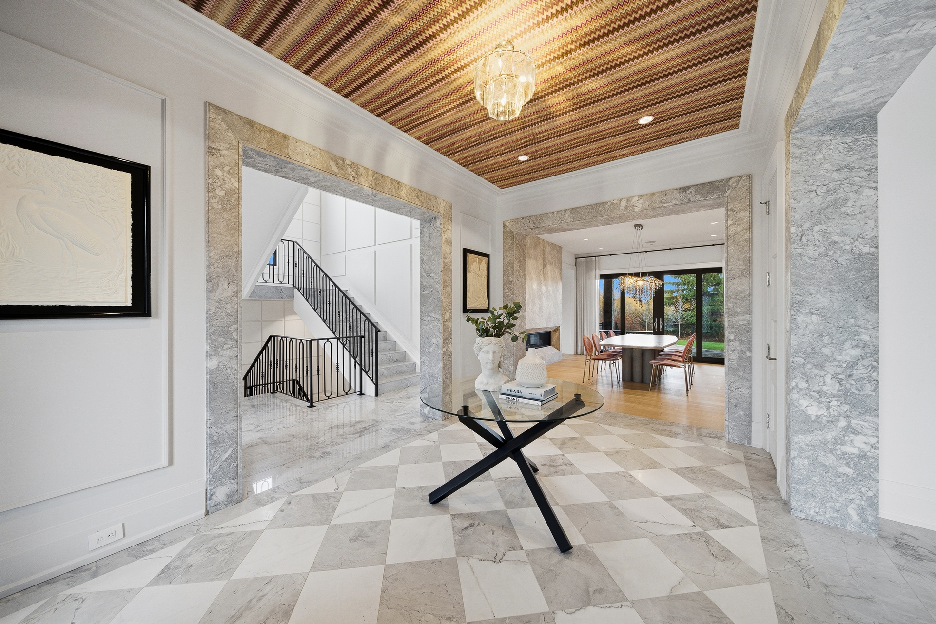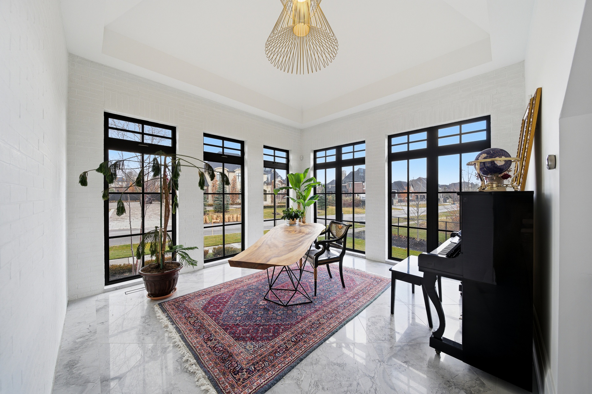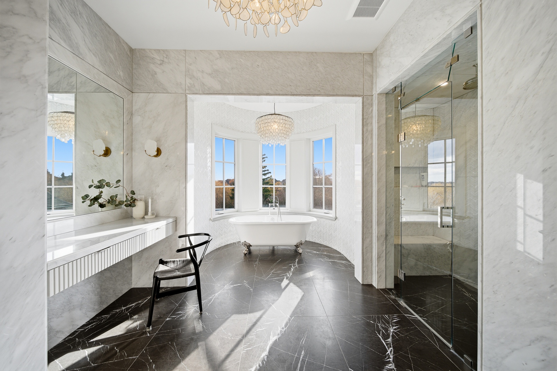 Experience uncompromising luxury in this custom-built estate offering approximately 9,500 sq.ft. of total living space, set on over half an acre backing onto a private ravine. Designed with exceptional craftsmanship, this residence features 10.5' main-floor ceilings, 10' ceilings on the second level, and approximately 9' ceilings in the walk-out lower level, all enhanced by custom millwork, natural stone slab flooring, white oak hardwood, and multiple designer fireplaces. With five bedrooms plus an additional nanny suite, the home is ideal for multi-generational living. The chef's kitchen showcases solid wood cabinetry, walnut detailing, a 60" Thermador panelled fridge/freezer, 48" rangetop, double Bosch ovens, a walk-in pantry and honed marble surfaces. The spa-like primary retreat includes slab marble walls, a steam shower, Victoria & Albert tub, heated floors and exquisite Mother-of-Pearl accents. Additional ensuites feature marble finishes, heated floors and premium fixtures. A main-floor guest suite, two laundry rooms, built-in closet lighting and full smart-home automation elevate everyday living. The walk-out lower level offers a gym with sauna, nanny quarters, cantina, bar area and a future theatre room. A 3-car garage with oversized 9' x 9' doors provides the option to install lifts for additional vehicle storage. Outdoors, enjoy a resort-style 16' x 38' saltwater pool with OMNI Logic automation, a cabana with kitchen and bath, outdoor shower, two loggias with a fireplace and BBQ, and extensive professional landscaping. A rare offering that blends modern elegance, advanced technology and exceptional indoor-outdoor living.