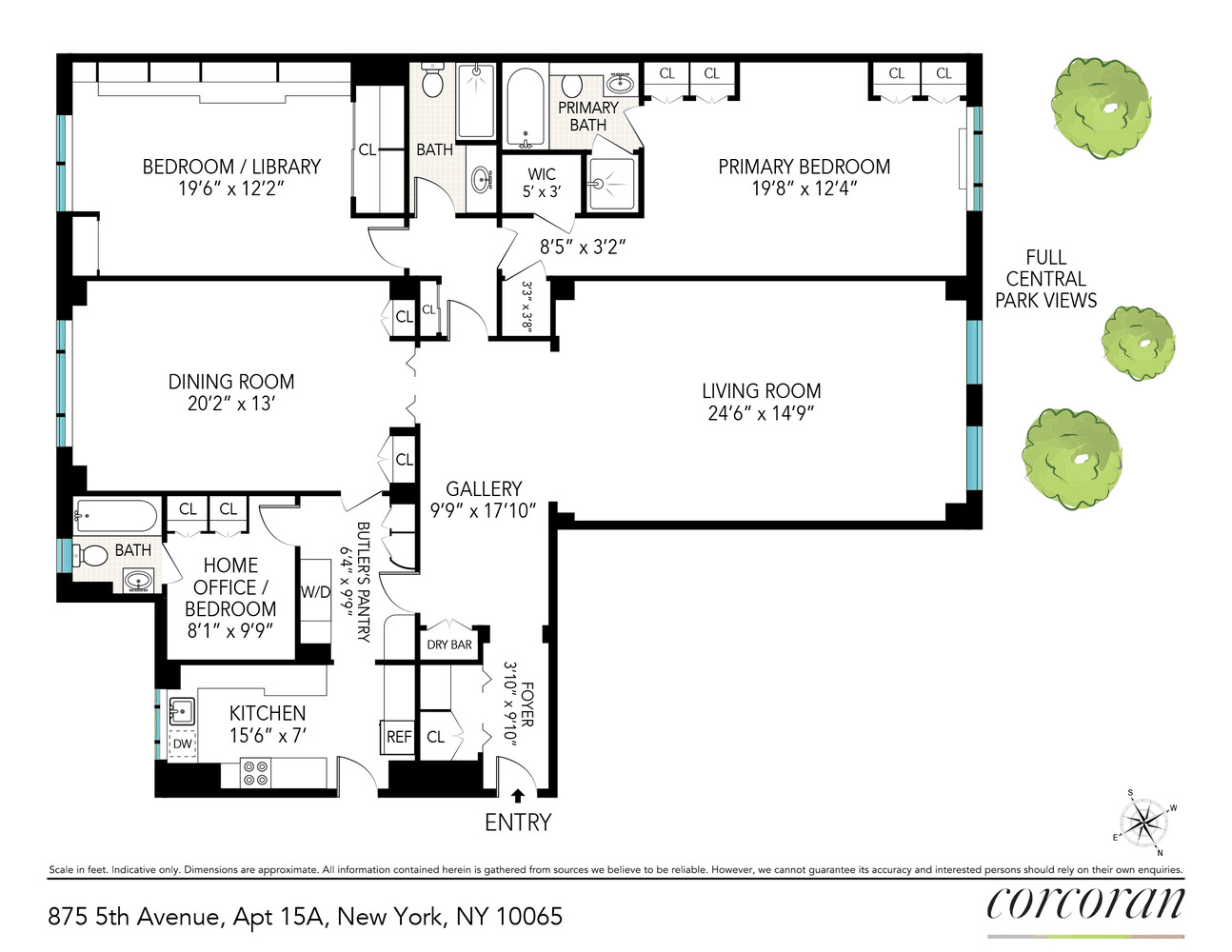 Set your sights sky high with views of the New York City skyline and all of Central Park. Apartment 15A at 875 Fifth Avenue is an oversized Classic 6 estate in one of Fifth Avenue's finest prewar white glove cooperatives on the stylish Upper East Side. Offered for the first time in over 50 years to be designed to your exact specifications, this rarely available A line property features direct Central Park views from all major rooms and exquisite light throughout the day from the East to West plus Western sunsets over Central Park. The expansive park-facing living room and eastern-facing formal dining room measure 54.5 feet from end to end, joined by a 17 foot gallery with an old-school dry cocktail bar.