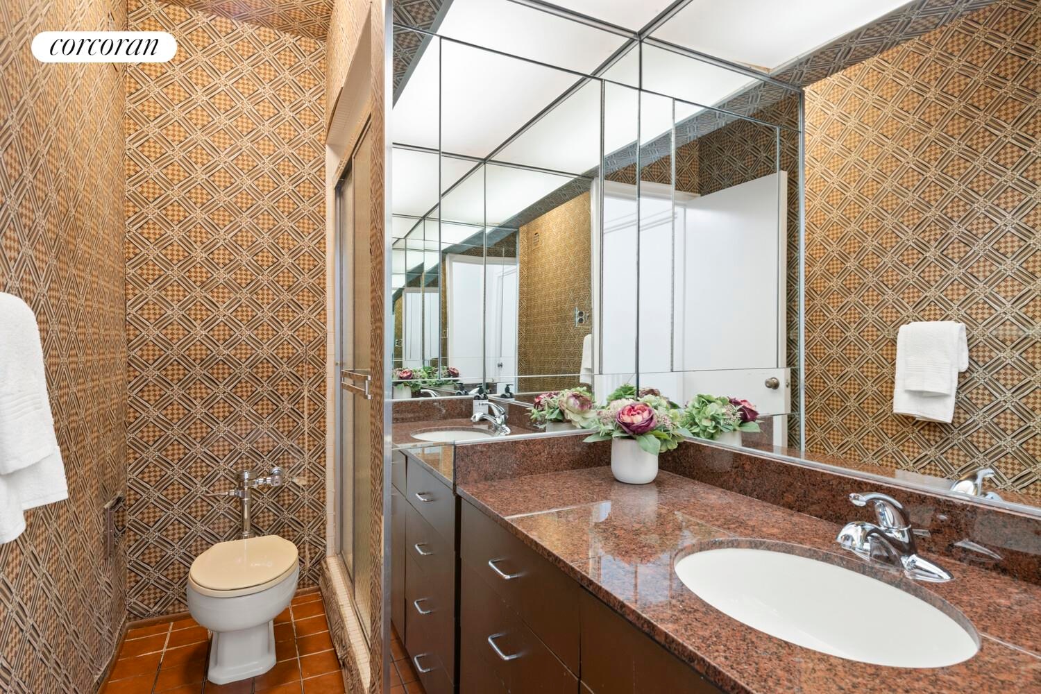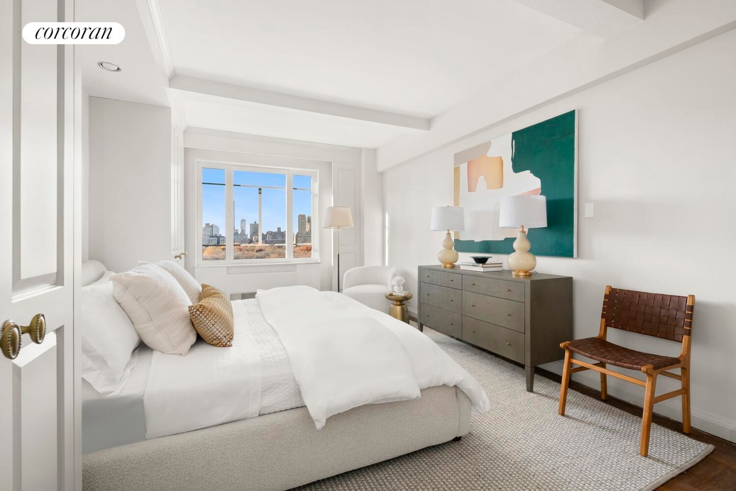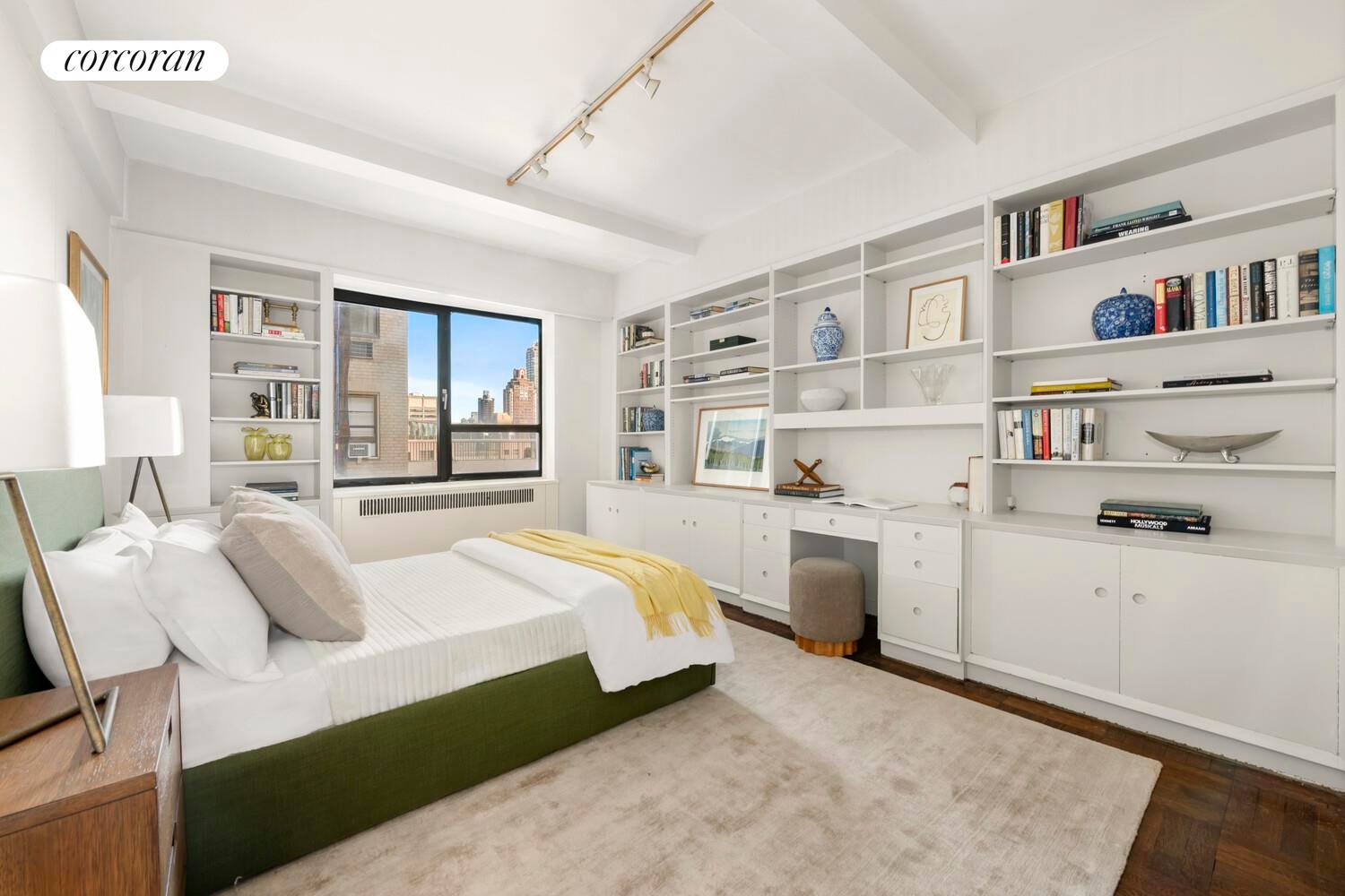 A second bedroom with a full bathroom enjoys a partially open eastern view of neighboring buildings and sky. The windowed galley kitchen and butler's pantry are adjacent to a staff room with its own ensuite bathroom, offering a myriad of redesign options.