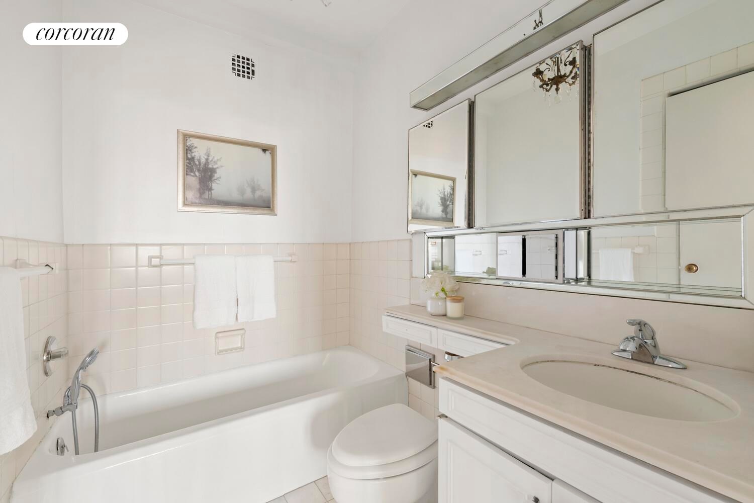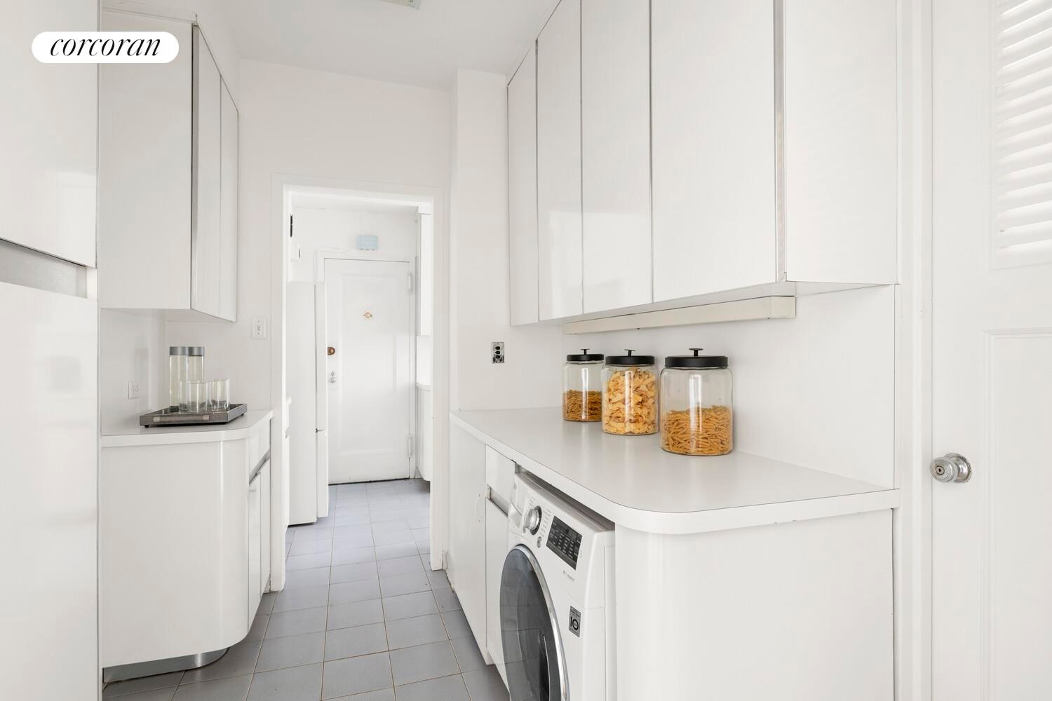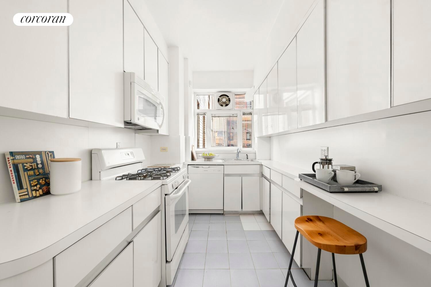 A second bedroom with a full bathroom enjoys a partially open eastern view of neighboring buildings and sky. The windowed galley kitchen and butler's pantry are adjacent to a staff room with its own ensuite bathroom, offering a myriad of redesign options.