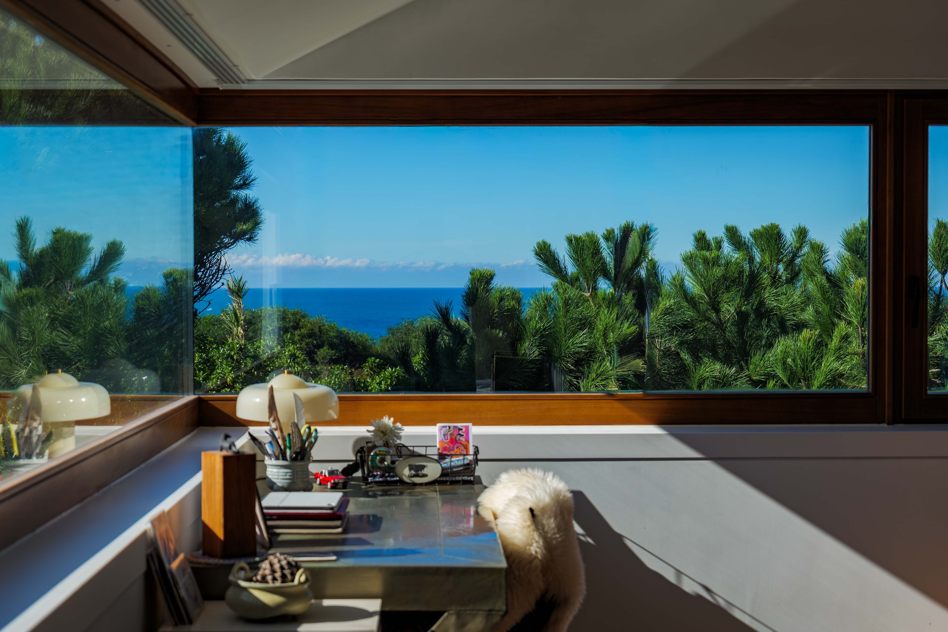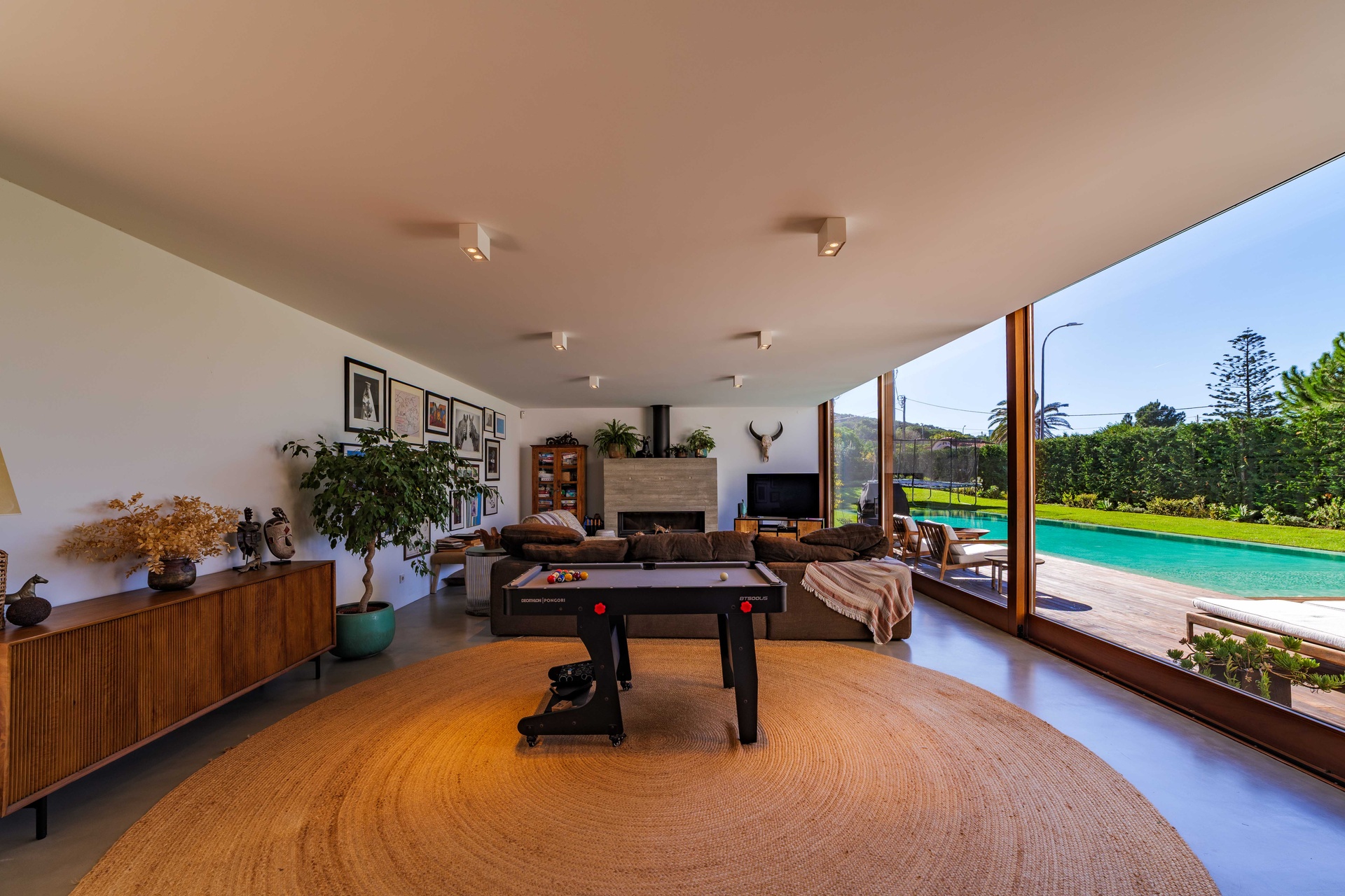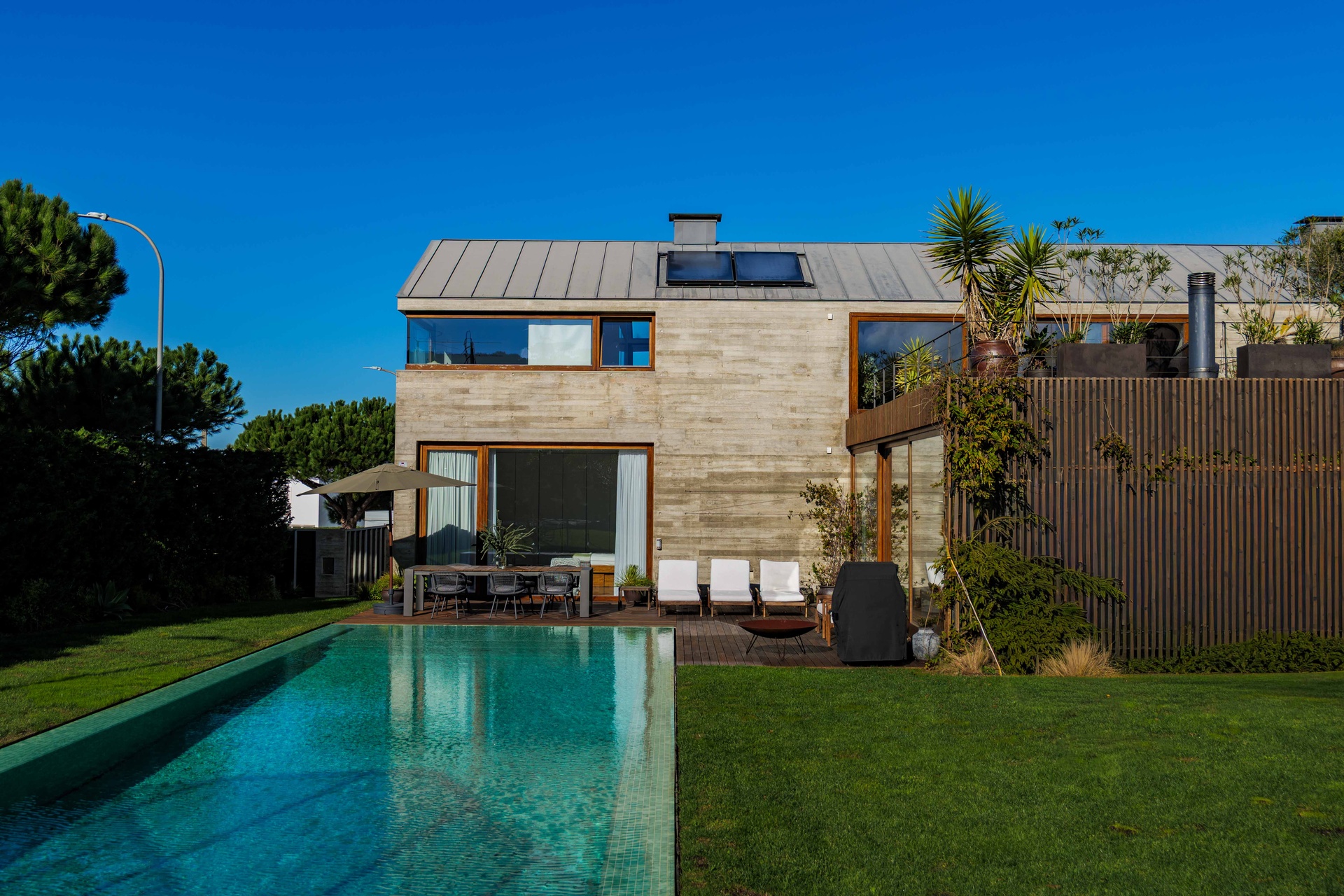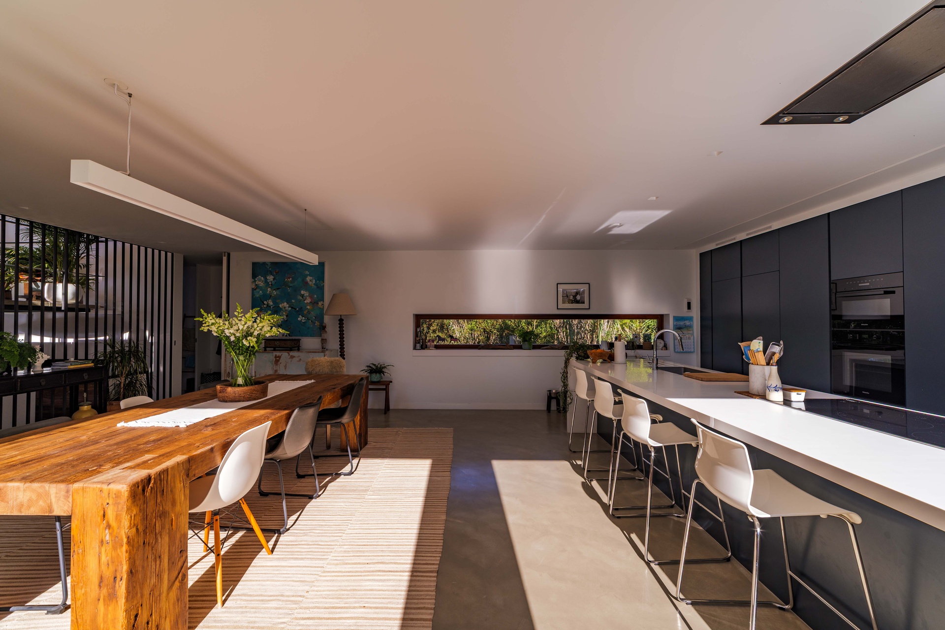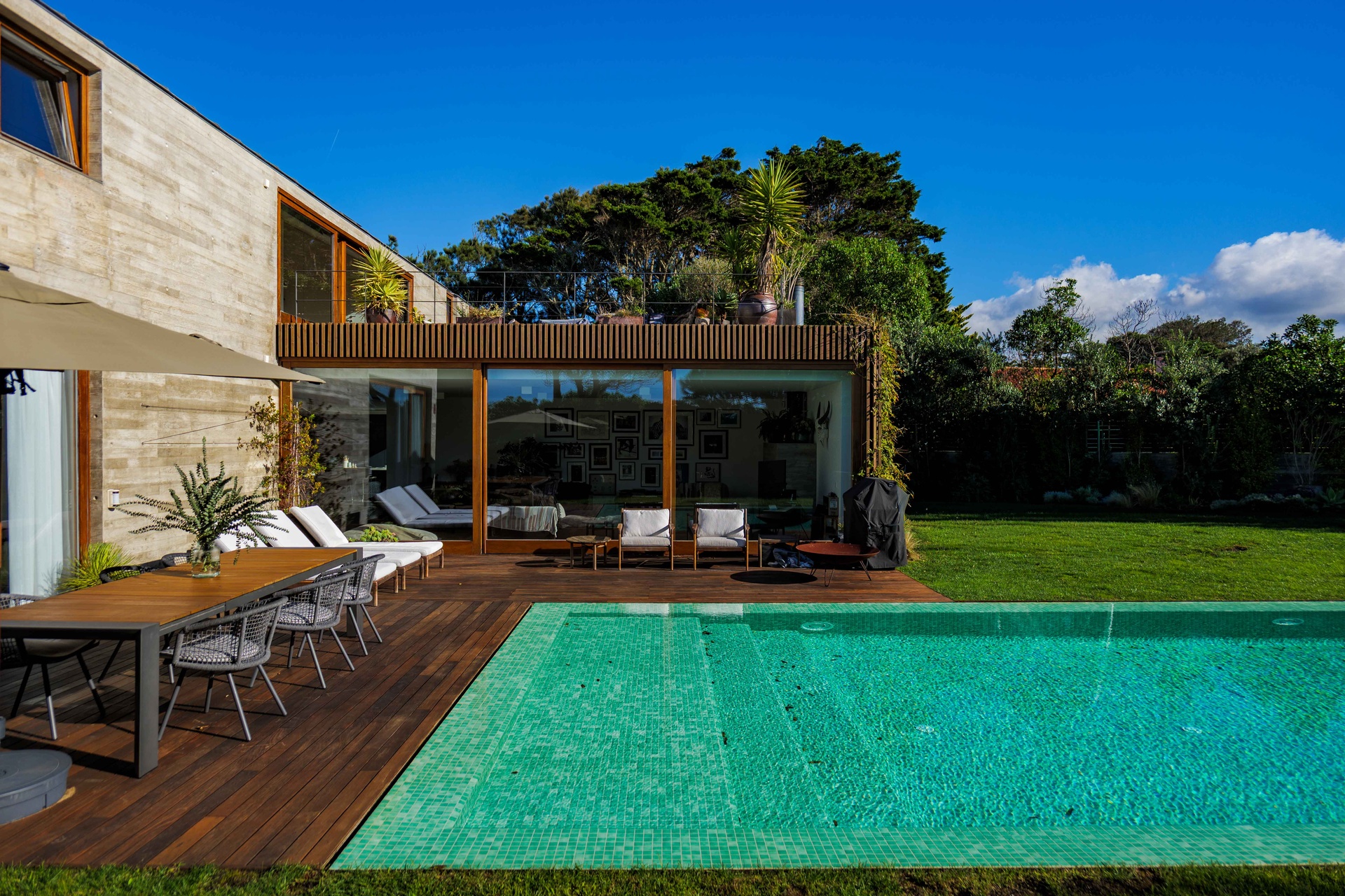 Featuring 4 spacious suites, the home was designed to maximise comfort and luminosity, with large windows framing the surrounding green areas and the ocean. The social areas flow seamlessly to the garden and swimming pool, creating the perfect setting for indoor–outdoor living.