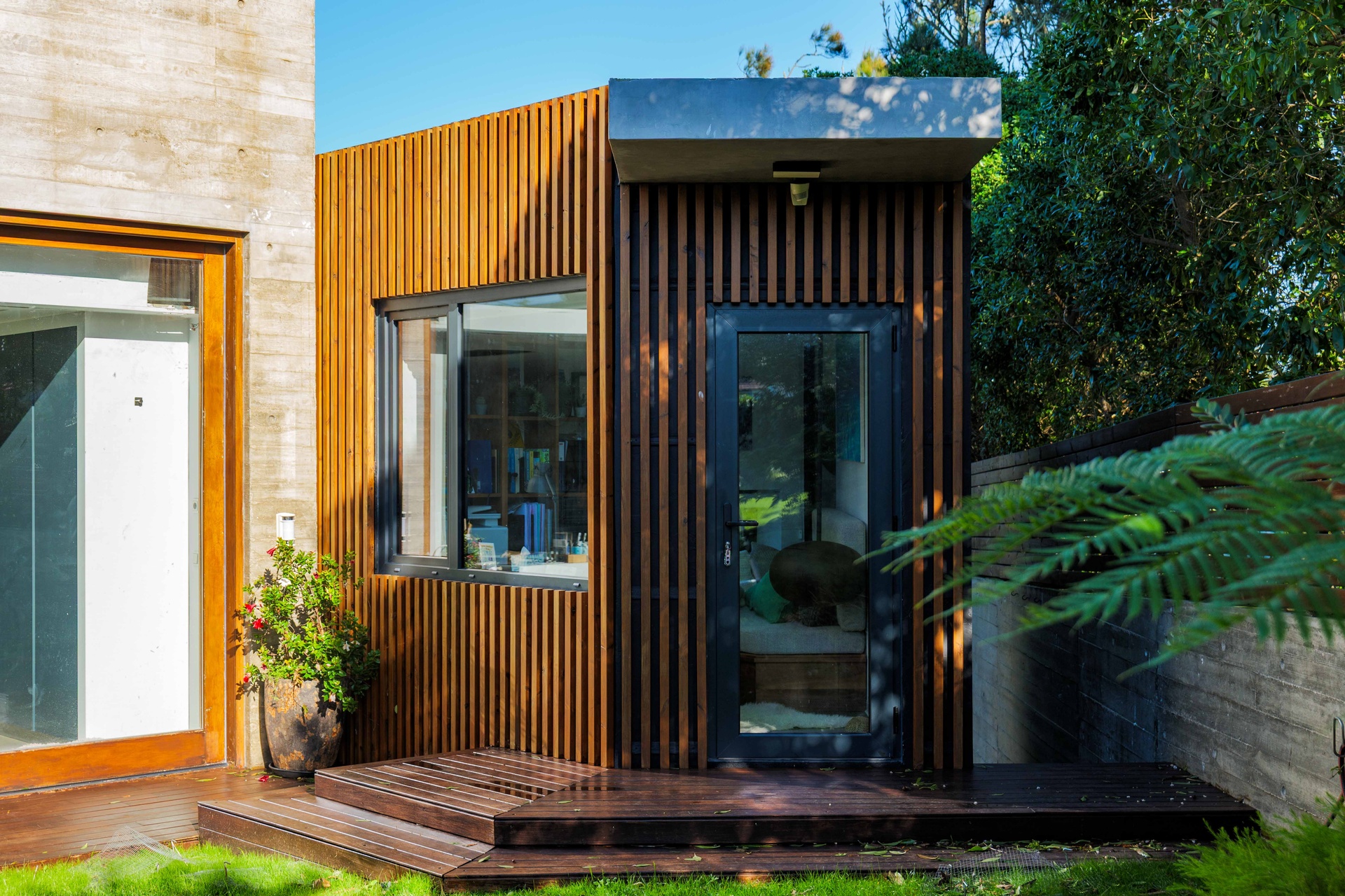 An independent detached annex with natural light and a fireplace serves as the ideal home office, studio, or relaxation space.