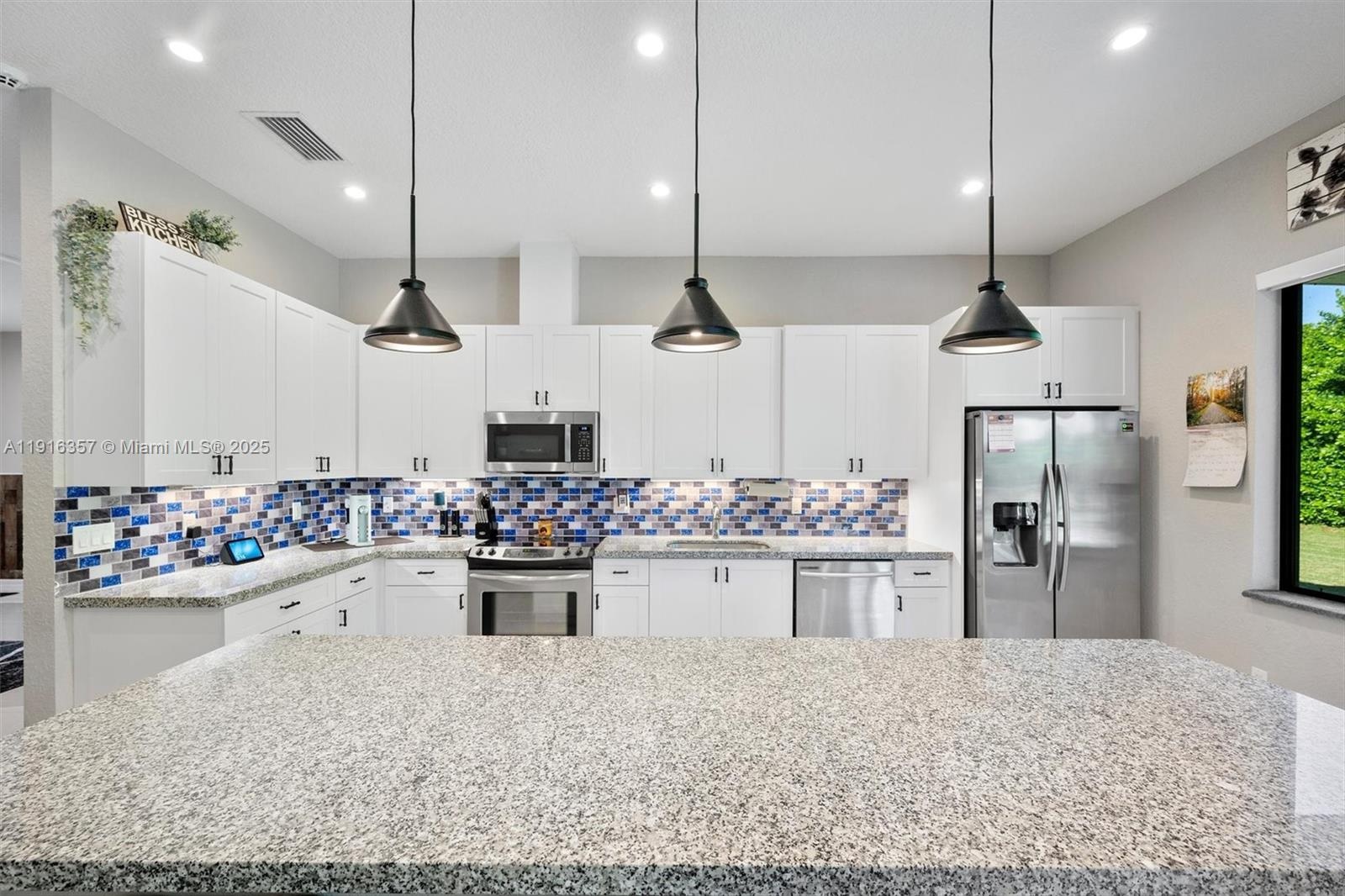 This inviting 3-bed, 2-bath home offers 1,777 sq ft of comfortable space with high ceilings and tall interior doors that create an open, airy feel. The generous living area features an upgraded electric fireplace with a faux-stone finish and mounted TV setup, flowing easily into a spacious kitchen with a large island, ideal for everyday use or hosting. You will love the size of the property and backyard, along with the added comfort of a covered patio roof. Recent improvements include refreshed bathroom flooring, an upgraded garage with epoxy floors and a mini-split, and an electric side gate. Enjoy an extended driveway, and a covered, insulated patio with ceiling fans that provides a relaxing spot year-round. No HOA! No CDD! Mortgage savings may be available for buyers of this listing.