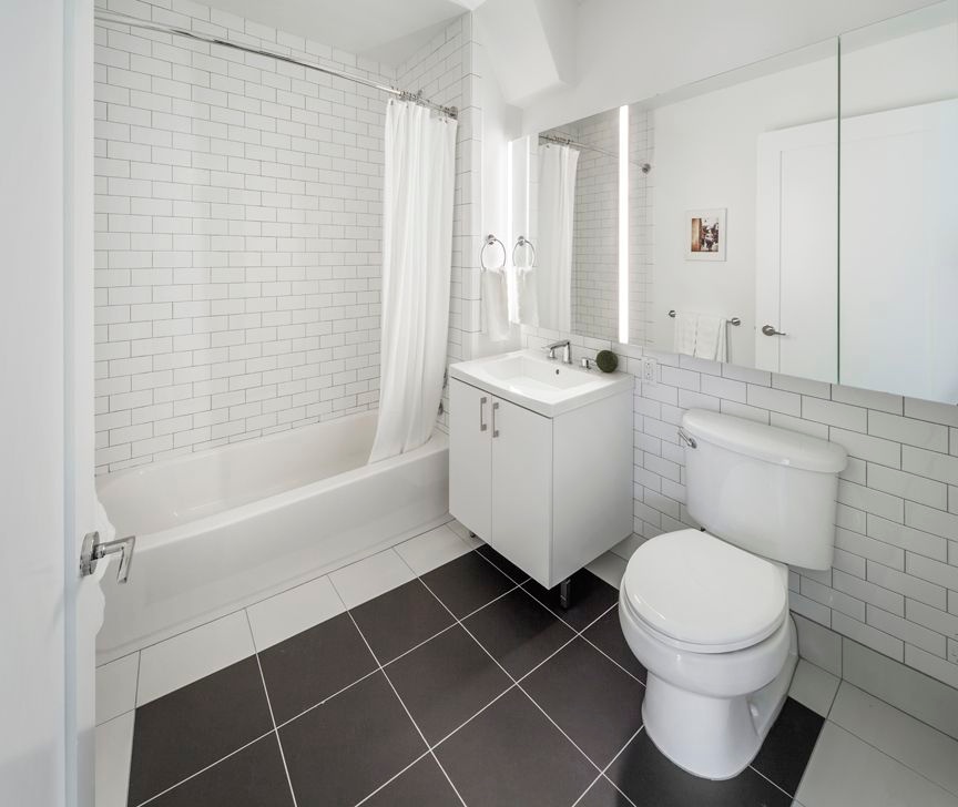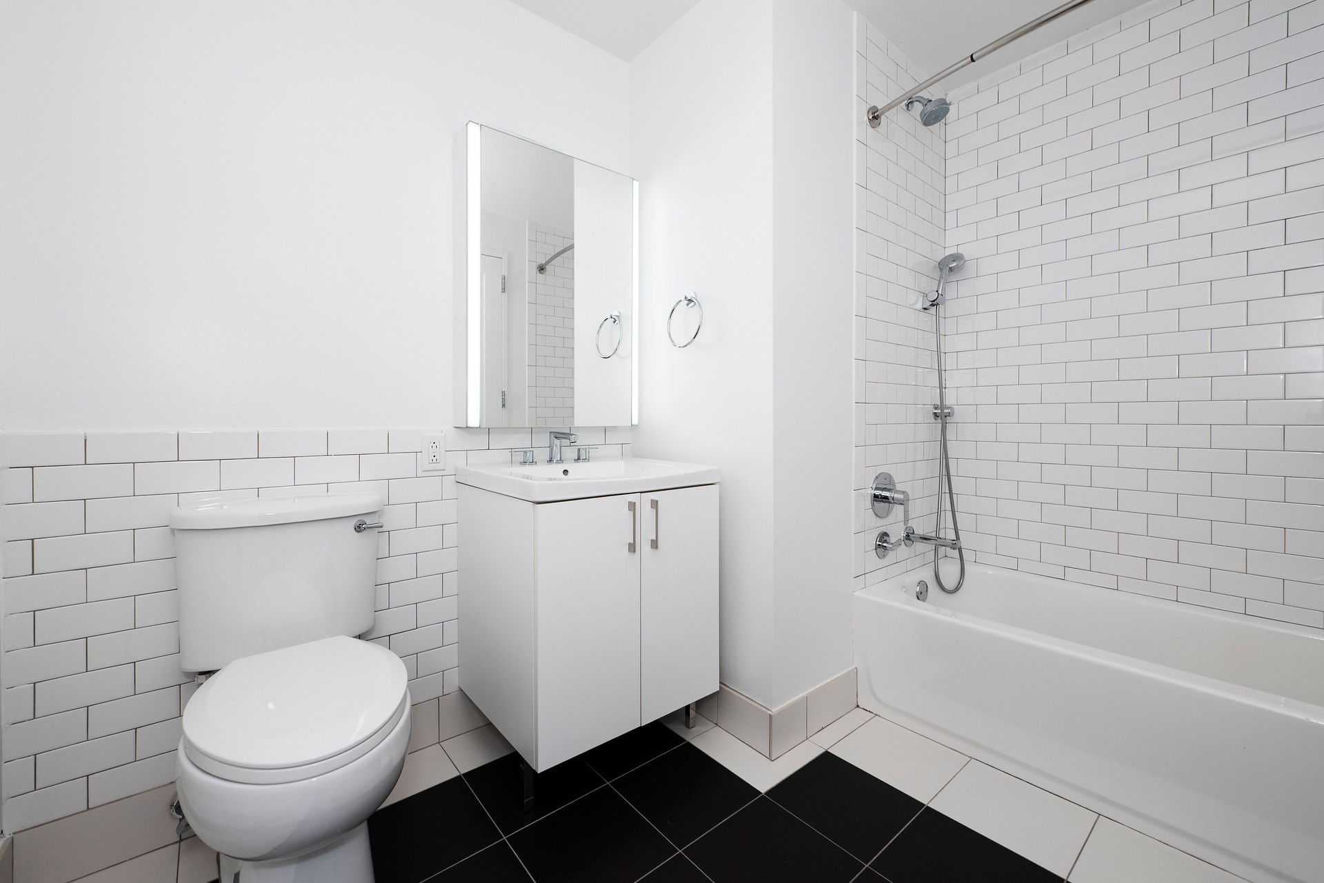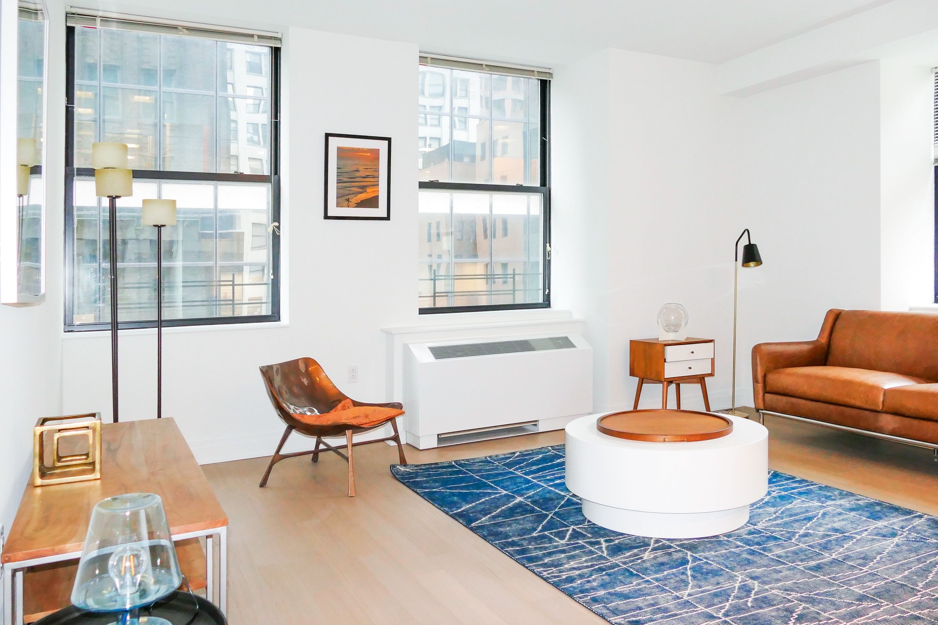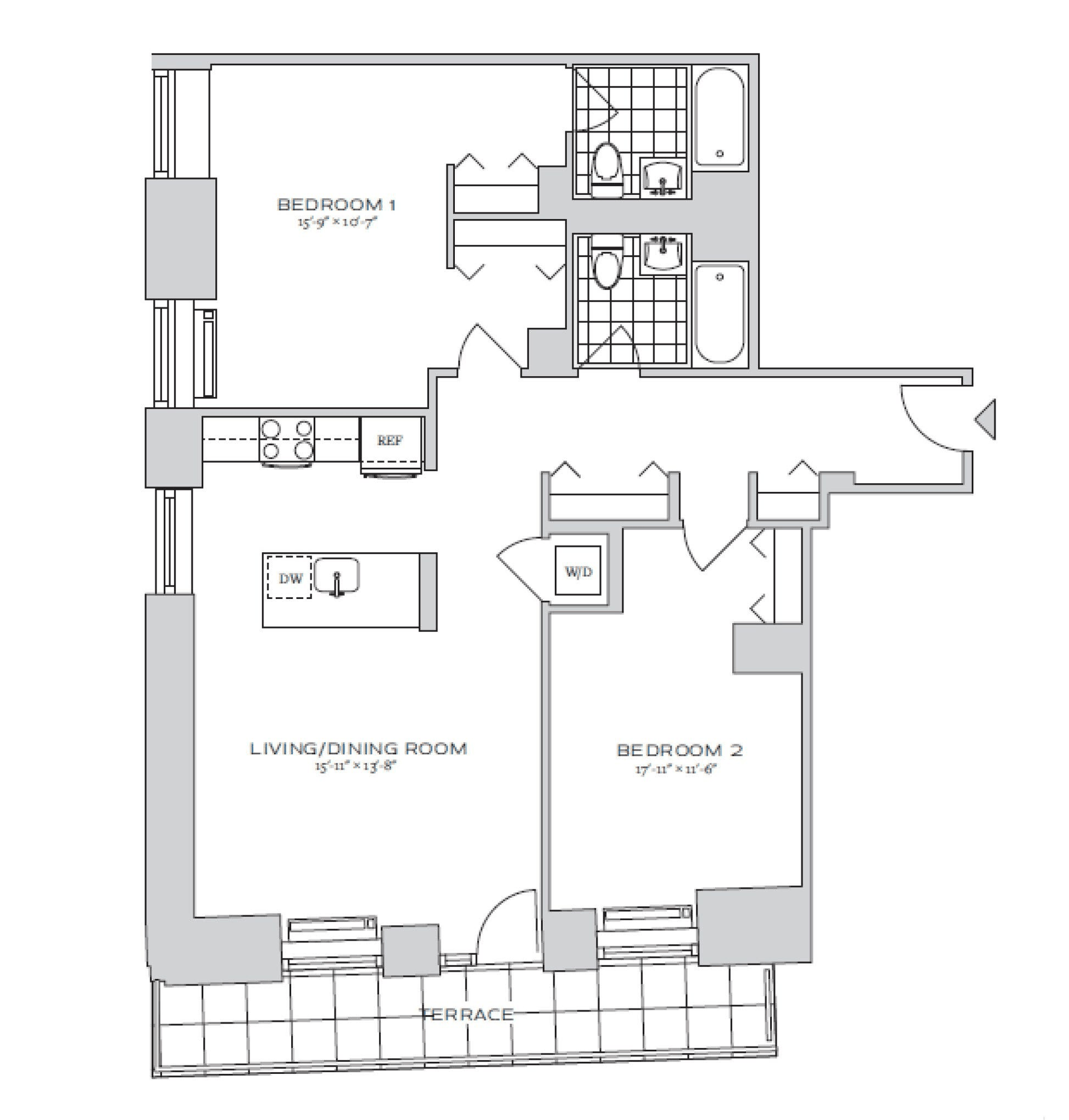 Corner 2 bed with private terrace, split beds, windowed gourmet kitchen, high ceilings, wood floors, and in-unit washer/dryer.