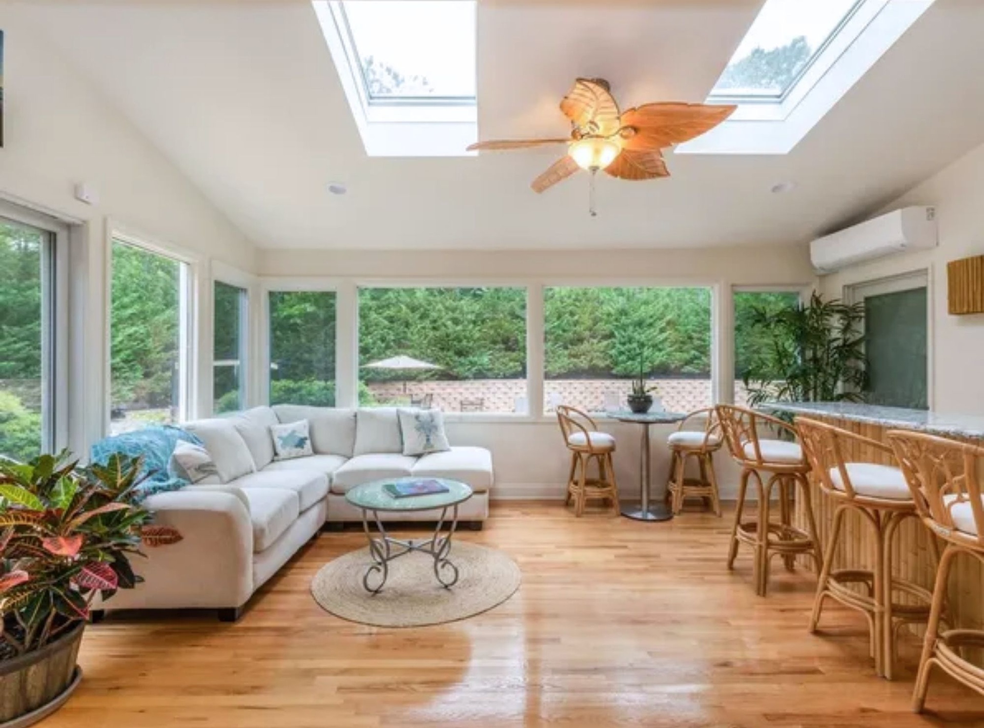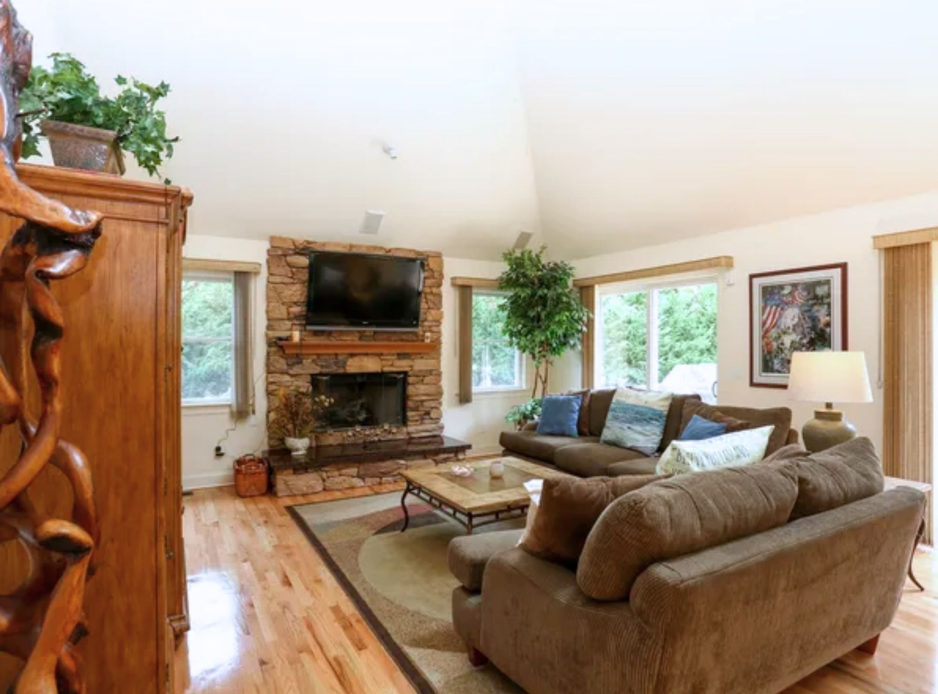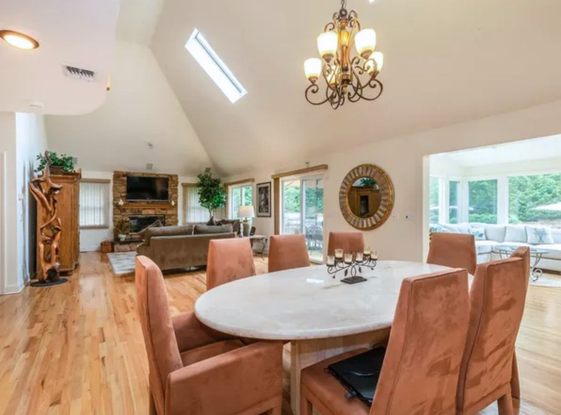 *Great room with open floor plan, vaulted ceilings, skylights, adjoining dining area for 10, and a gas fireplace