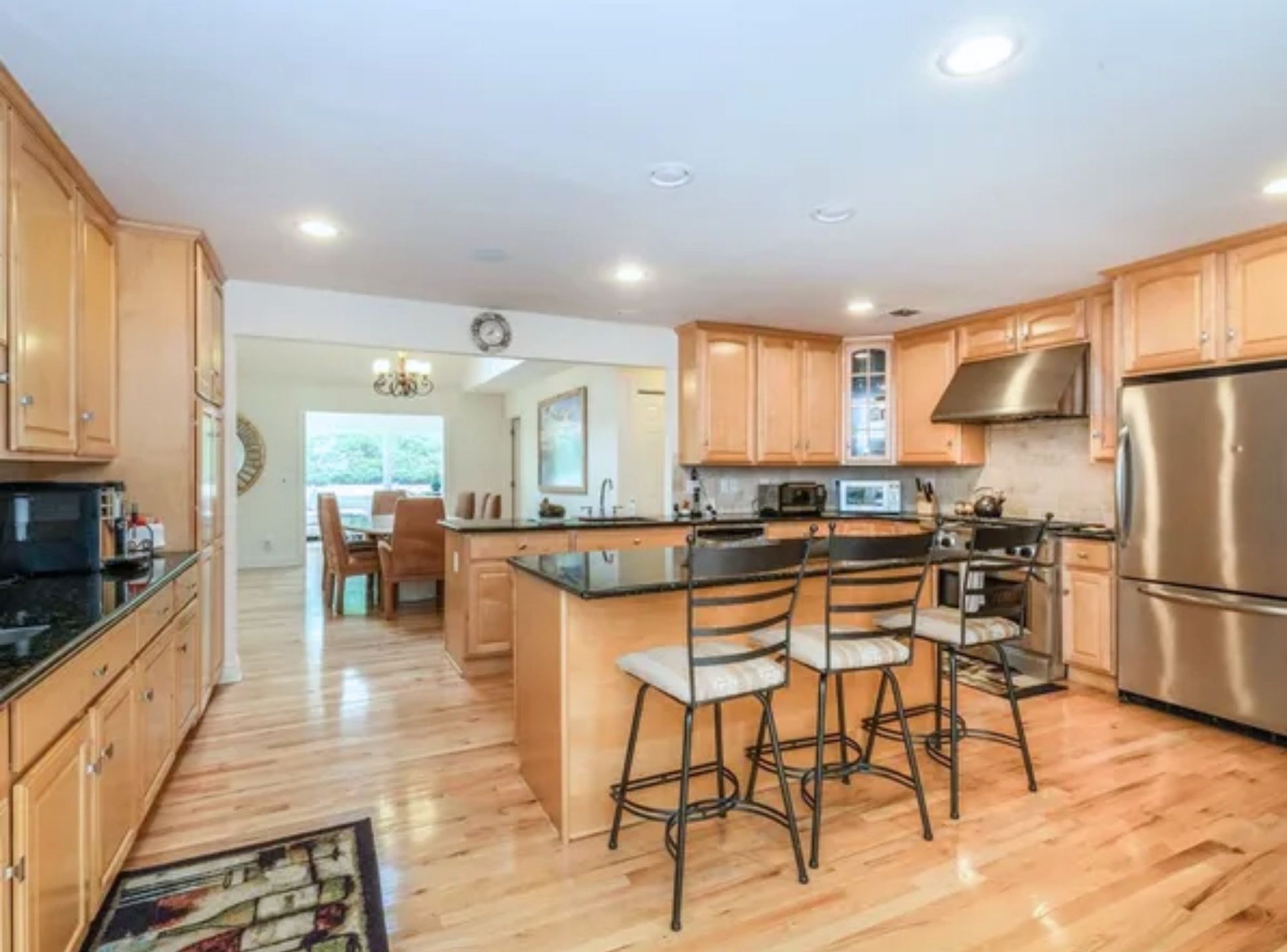 *Chef’s kitchen with stainless-steel appliances and island seating