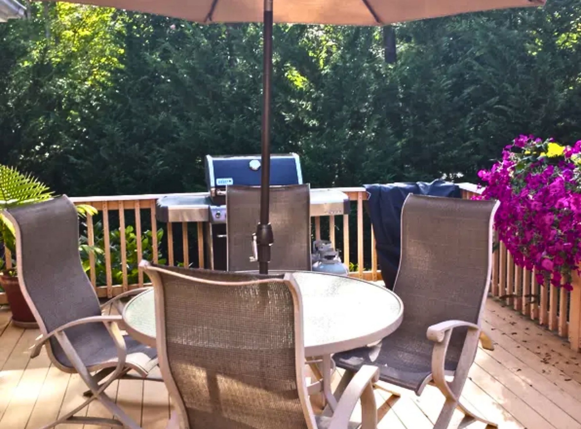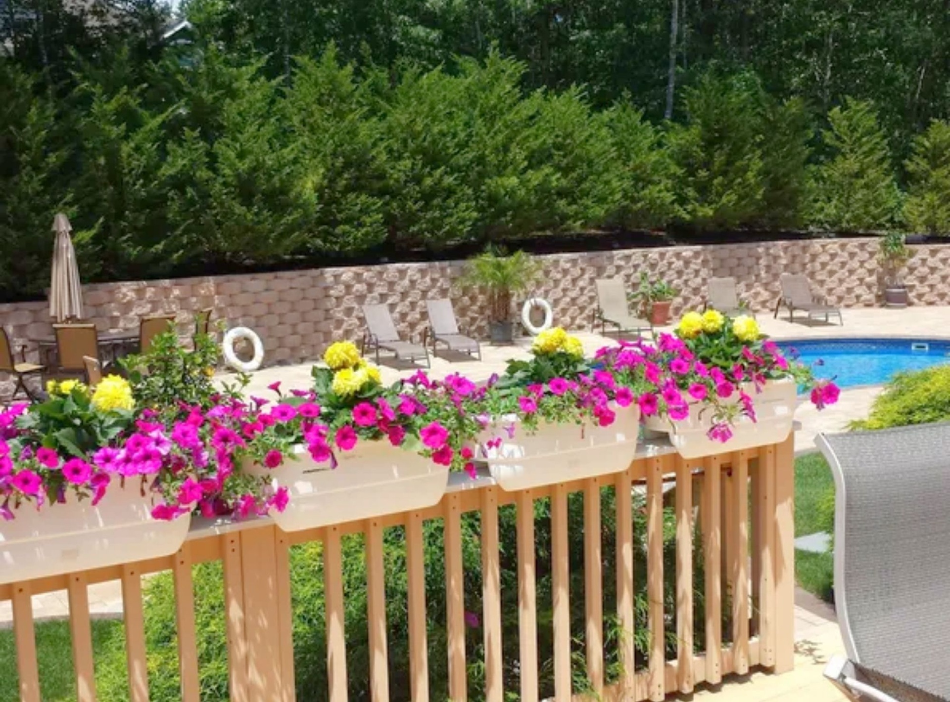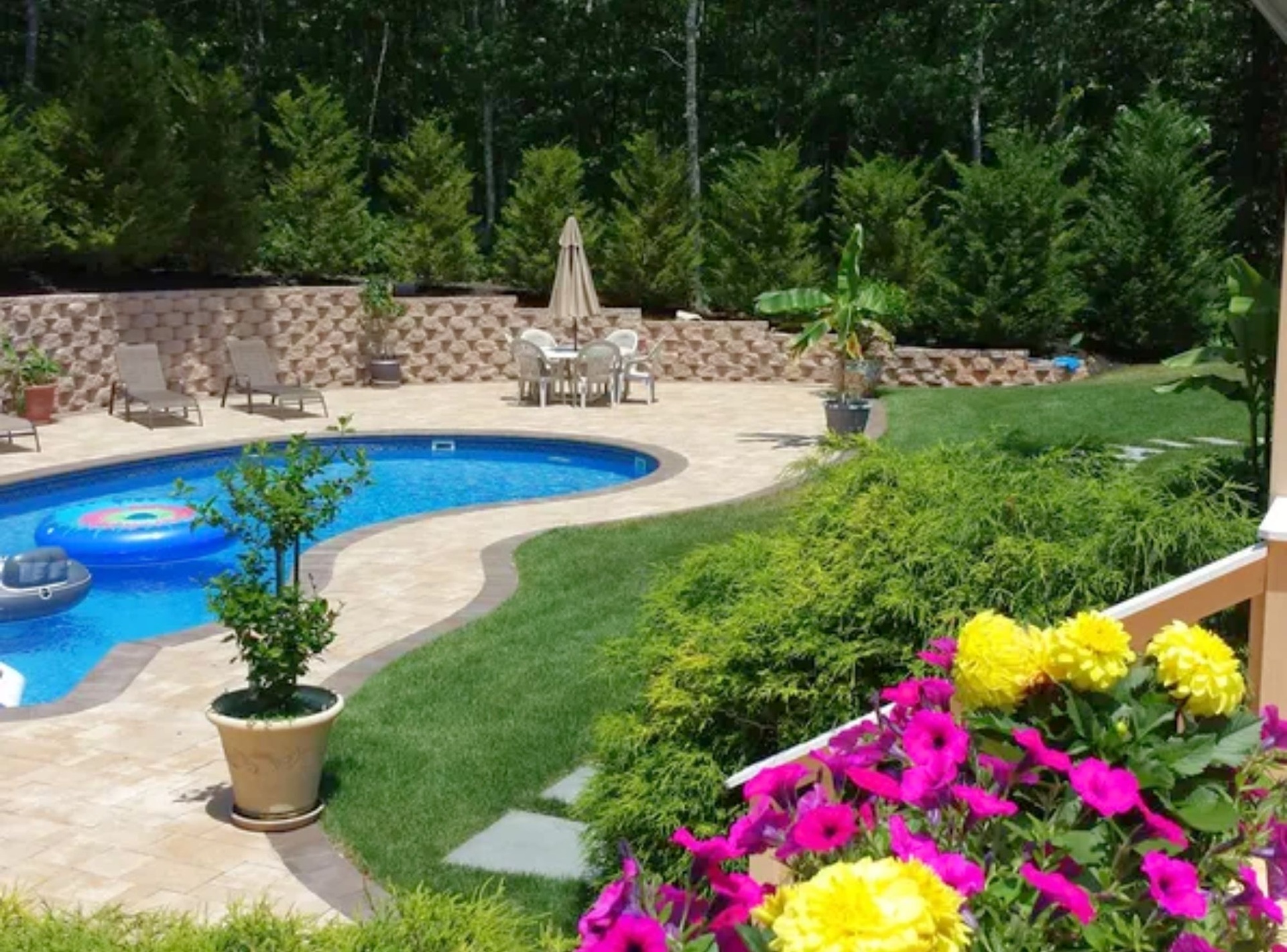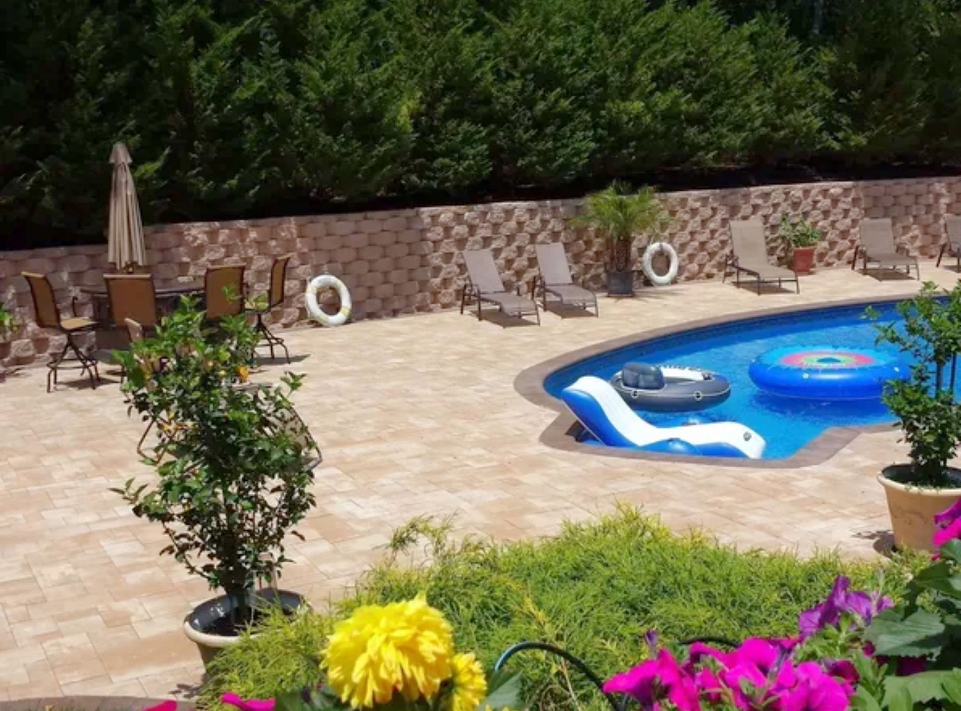 *Private Backyard with heated pool, expansive surrounding pavers, adjoining deck with 10-seat picnic table and BBQ, griddle, outside bar,2 gazebos with seating for 10, chaise lounges, multiple floats, games provided