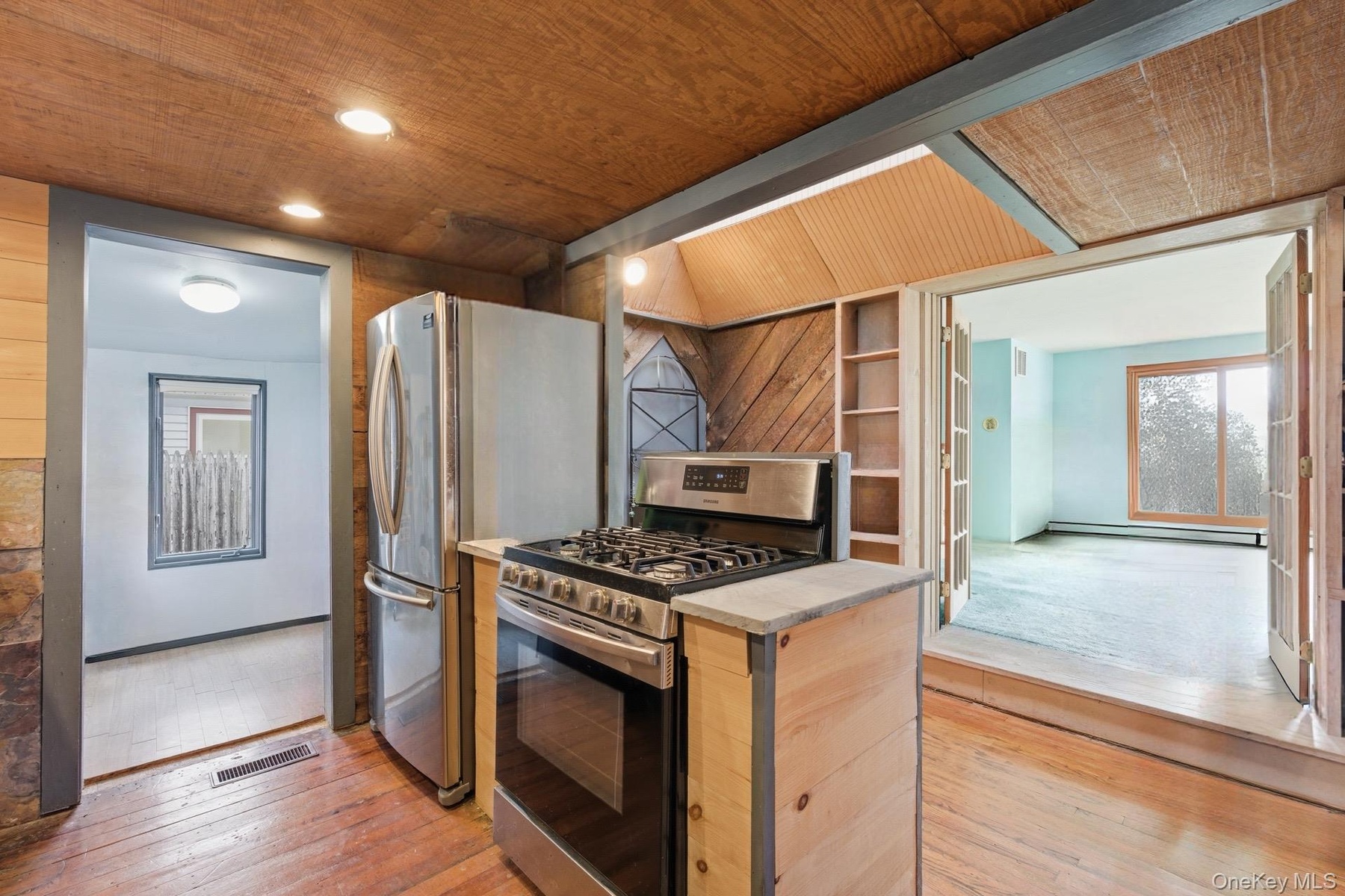 The kitchen is centrally located for everyday convenience, showcasing striking copper countertops and a welcoming eat-in area that’s perfect for casual meals and easy gatherings—nothing about this home says cookie-cutter. It’s a castle near the sand.