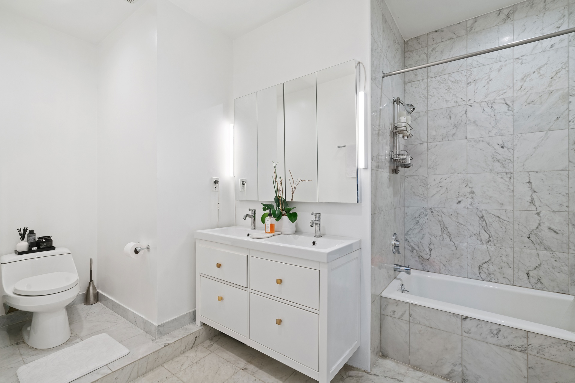 The oversized marble bathroom offers spa-like comfort with a stall shower, Jacuzzi tub, and generous storage. A gourmet open island kitchen is outfitted with high-end appliances and a washer/dryer, ideal for those who love to cook or entertain.