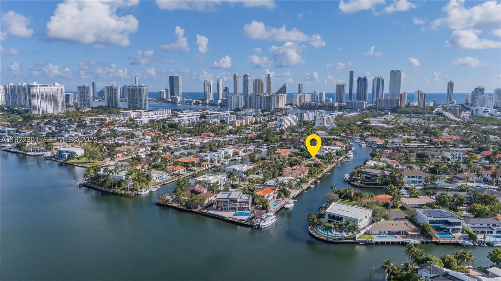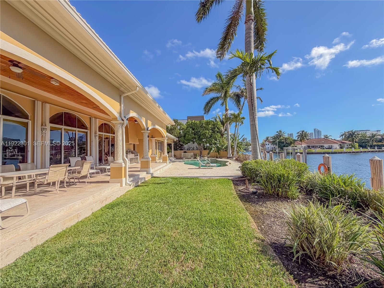 Live the coastal lifestyle in this expansive one-story home set on two beautiful waterfront lots, offering 160 ft of water frontage and a 140 ft dock with ocean access. Relax by the pool, take in the South-facing views. No fixed bridges to Haulover Inlet. Thoughtfully designed with custom finishes, the home features high ceilings, 4+ bedrooms with potential to add more bedrooms, a spacious master retreat with two walk-in closets, an eat-in kitchen, wet bar, and formal dining. Sun-filled rooms open directly to the patio, pool, and water. Located in a prestigious 24-hour guard-gated community, you're just minutes to the beach, shopping, movies, dining, and Oleta State Park.