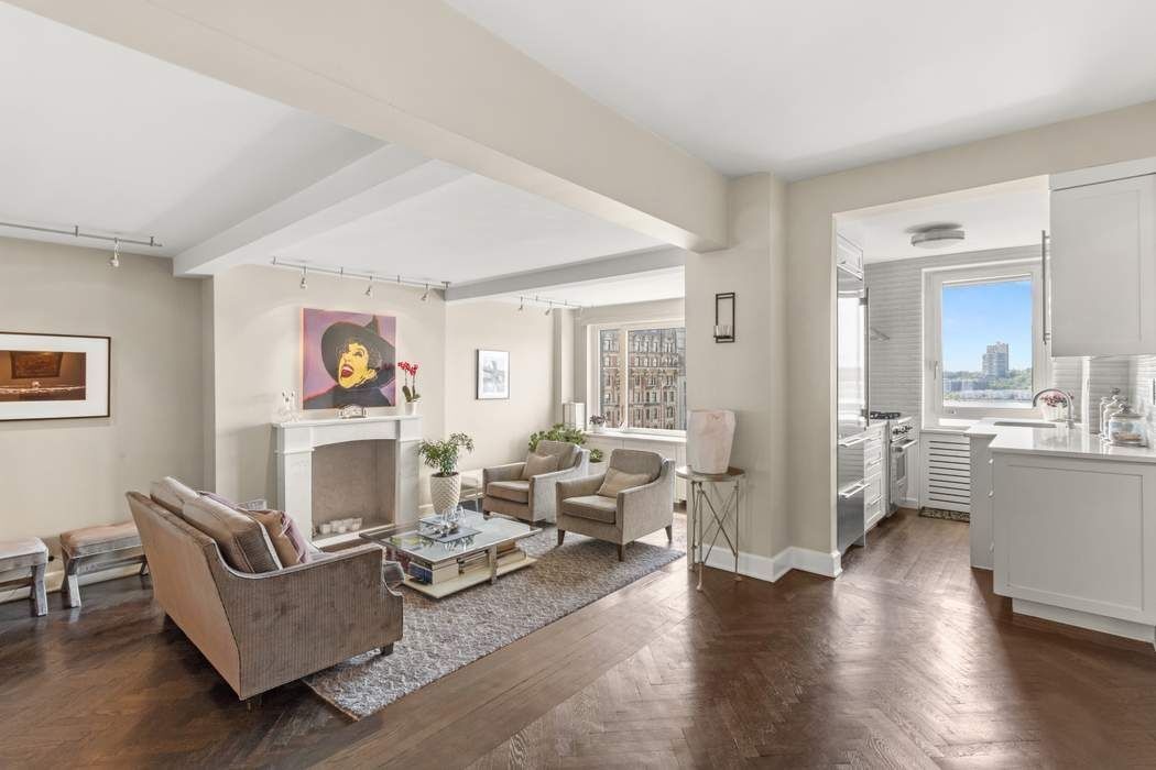 As you enter the apartment you are welcomed with an enormous dining foyer, set above the sunken living room. Open and expansive, the living room features giant tilt and turn picturesque windows, decorative antique marble fire place, custom designed walnut credenza with wine refrigerator, lutron lighting, through wall Fredric a/c that is housed within the custom cabinet with vents and quartz counter tops. Herring bone patterned floors and tall beamed ceilings round out the overall look throughout the apartment.