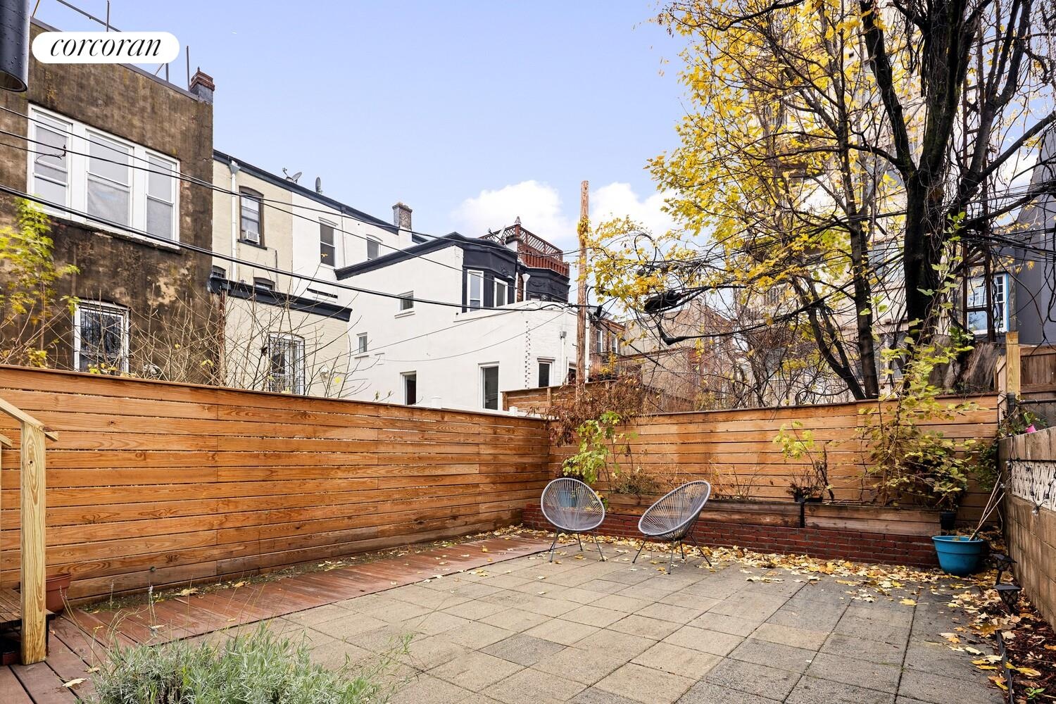 Head up a grand stoop past a deep garden that affords this lovely home a great deal of street privacy, in addition to endless gardening opportunities. Distinguished by an ornate limestone facade with elegant fleur-de-lis detailing, a handsome cornice, oversized windows, and a decorative iron fence, the historic facade perfectly reflects the museum-quality period details that await inside. Prepare to fall in love with a massive parlor floor replete with mahogany fretwork; window, base and ceiling moldings; a Piers mirror; stained-glass transoms, inlaid nail-head floors; plaster picture moldings and ceiling medallions; and bay windows in both the front and the back. A uniquely deep layout affords the opportunity for a gracious living room, formal dining room, sunny eat-in kitchen, PLUS an additional guest room or home office all on one floor. There is even a renovated full bathroom on this level, the perfect accompaniment to the guest room. The renovated kitchen includes a vented stainless stove, painted black kitchen cabinetry, honed black granite countertops, stainless steel GE Café appliances, great storage and pantry space, plus a discretely placed full-sized vented washer and dryer. Due to the unique depth of this property, you will even enjoy windows in the center that bring light in all day and offer charming views of a landscaped and spacious backyard. Attention to both bluestone hardscaping and intricate planting beds allows just the right combination of hang-out space interspersed with the well-needed greenspace that only townhouse living provides. This floor and the bottom floor both have easy walkouts to the garden as well for the perfect indoor/outdoor lifestyle.