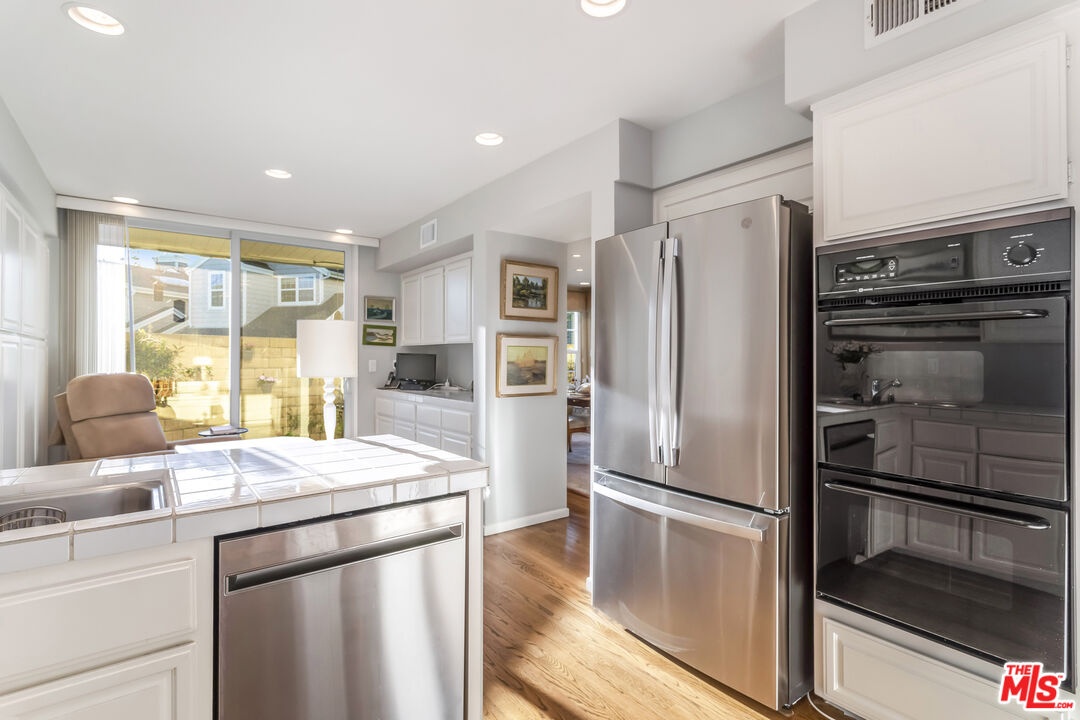 Experience quintessential SoCal living in this beautifully appointed 2-story freestanding home tucked inside a 24-hour guard-gated community. With no shared walls, this single-family style residence offers exceptional privacy on a rare south-facing corner lot. A charming garden patio welcomes you through a private gate, creating a peaceful outdoor retreat. Inside, double front doors open to an expansive, sun-filled living room with fireplace, a generous formal dining room, an eat-in kitchen that leads to private BBQ patio, a dedicated laundry room and an updated powder bath. The first-floor features hardwood floors, classic white shutters, and French doors connecting seamlessly to the patio. Upstairs, a loft overlooking the living room provides the perfect spot for a home workspace. A large second bedroom sits alongside a remodeled full bathroom. The spacious primary suite offers lofted ceilings and ample room for a relaxing sitting area, while the bright en-suite bath includes dual vanities, a walk-in shower, soaking tub, and private WC. Additional highlights include a two-car garage with ample storage, guest parking conveniently located directly across from the home, a seat stairlift to assist up the stairs and the HOA recently installed a new roof. The community features beautifully manicured, park-like grounds, private streets, and desirable amenities such as a pool with bathrooms, tennis courts, pickleball courts, and two spas. All of this is just minutes from beaches, boating, Waterside Shopping Center, restaurants, grocery options, and the best of Marina del Rey. With thoughtful upgrades, this private, hidden enclave offers turnkey living - just move in and enjoy!