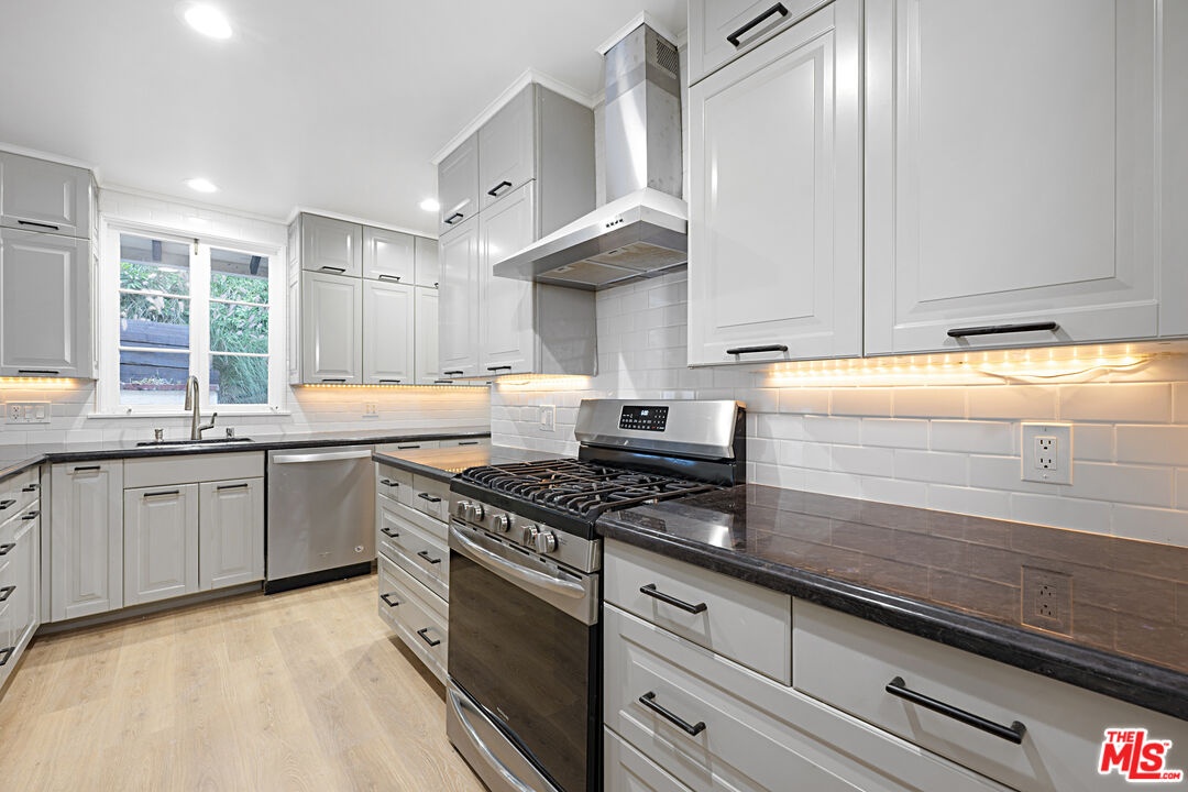 You will not find a better value in the Lower Hollywood Hills on a move in ready home with separate guest house. Incredible location with canyon living and city convenience at the mouth of Nichols Canyon on a flat pad just 3 blocks from the Sunset Strip. This ultra private and newly remodeled 3 bedroom 2 bathroom contemporary ranch has a large living room with vaulted ceilings, a massive fireplace with built ins and office nook. Past the living room is the central dining room that flows to the chefs kitchen with floor to ceiling subway tiles, quartzite counters and stainless appliances. The spacious primary bedroom features a brand new bathroom, two closets and French doors that lead to a sunny deck with views of the canyon. There is a large secondary bedroom with office area and a third bedroom or den at the front of the home. Front and rear entertaining spaces with rear brick patio large enough for outdoor kitchen, dining and living areas along with a flat front yard and huge sunny deck with canyon views. Tucked under the home is the remodeled guest house which could act as a 4th bedroom with separate entrance, full kitchen and bathroom. Great opportunity to buy a move in ready home with all the right updates including new flooring, bathrooms, HVAC, 200 amp electrical panel, drains, retaining wall and many other upgrades.