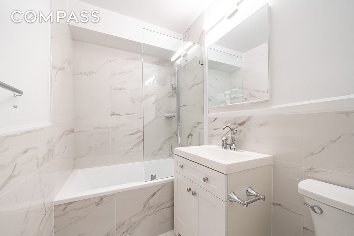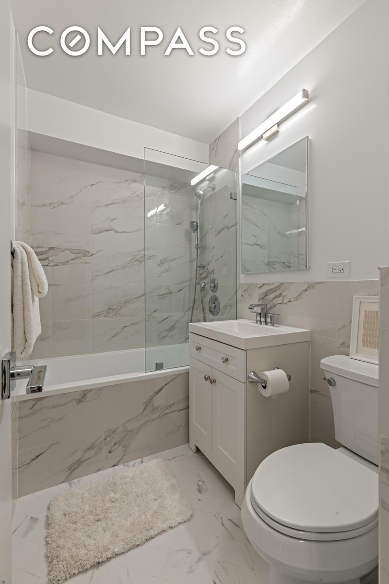 The primary suite boasts eastern exposures and an oversized room that can accommodate for fitting a king-sized bed, two end tables, seating, a desk, and more. also with east exposure Your luxurious en-suite bathroom features all new pipes, valves, stone, and fixtures with spa like features along with a half glass shower/tub door with spa like features. Brand new throughout.