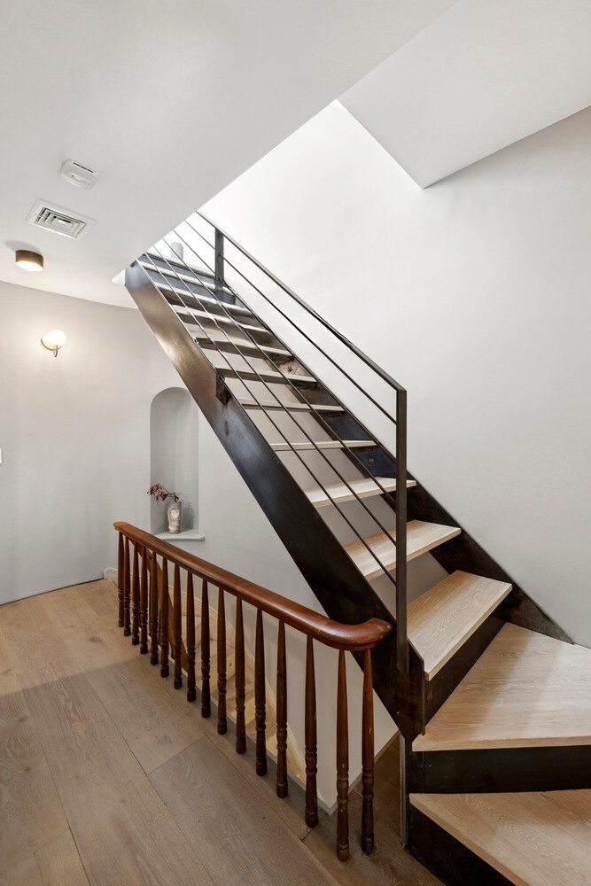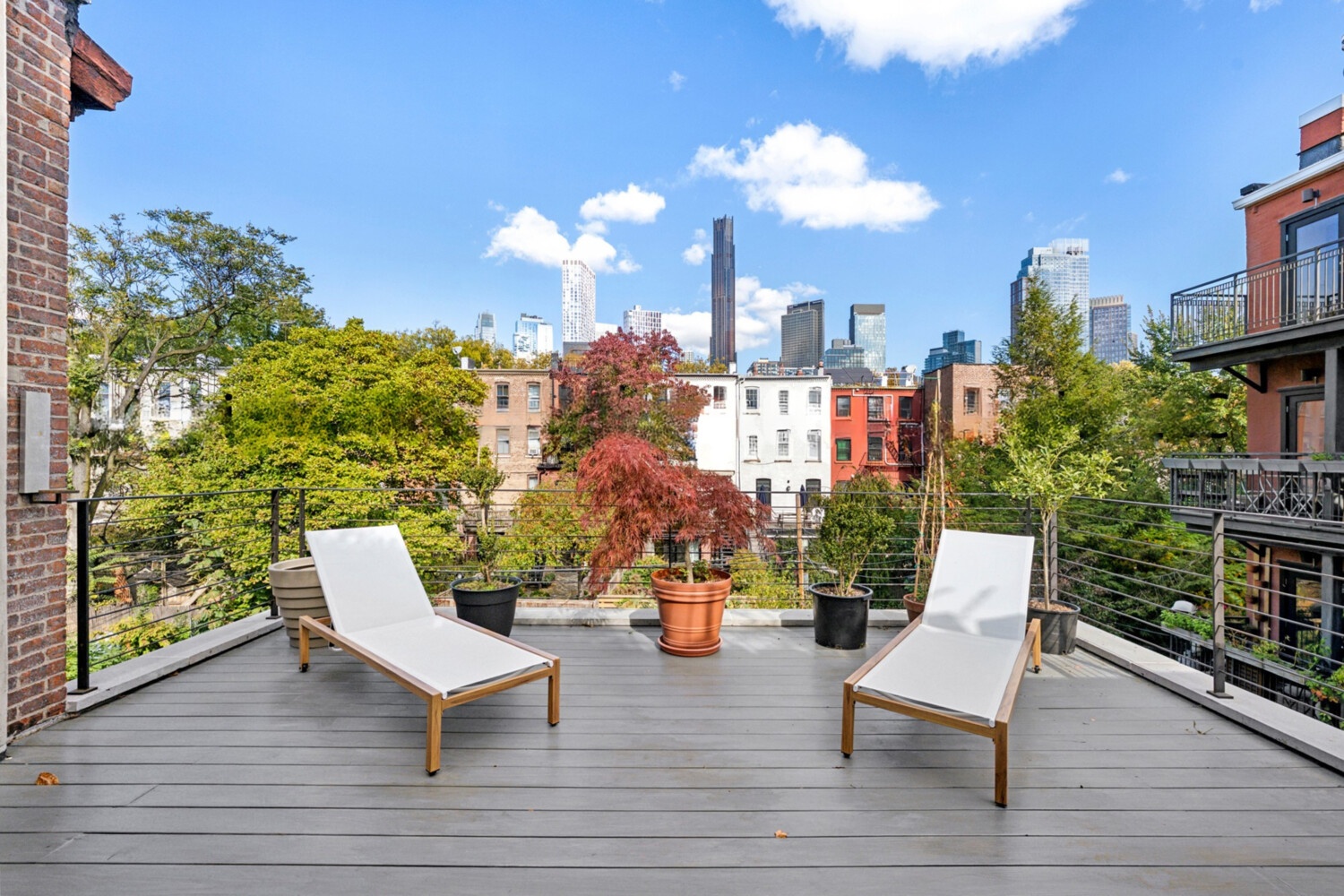 The upper residence offers three bedrooms, two and a half baths, and an extraordinary amount of private outdoor space across multiple levels. Sun-filled living areas connect to expansive decks on every floor, ideal for morning rituals, alfresco dining, and warm evening lounging. An efficient Italian kitchen with similar finishes and appliances. Bedrooms are generously scaled, the layout is impeccably efficient, and natural light floods every room. A true indoor-outdoor experience in the heart of Brooklyn. An architectural custom staircase ascends to a vast private roof deck with sweeping Manhattan and Downtown Brooklyn skyline views - a true crown jewel and a rare luxury in Boerum Hill.