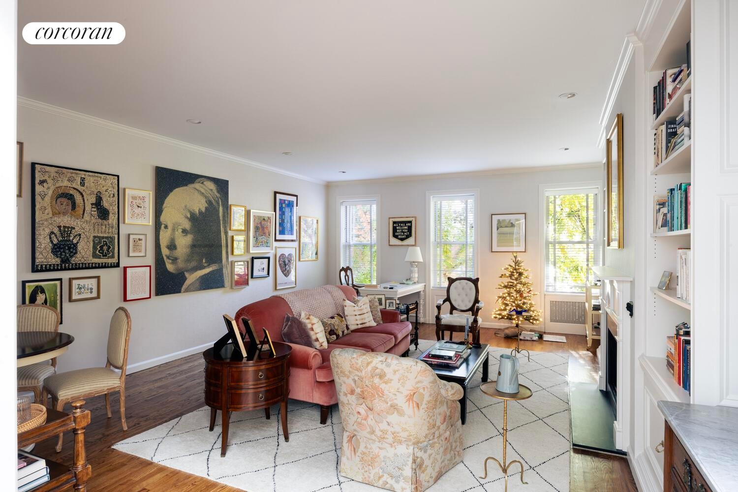 A real chef's kitchen is open to a double-height family room with French doors leading to the garden. The garden-facing living room, also with 20 foot ceilings, is both grand and charming, and a formal dining room at the front of the house is currently configured as an inviting sitting room. There is also a powder room discreetly tucked away on this level, as well as direct access to the private garage.