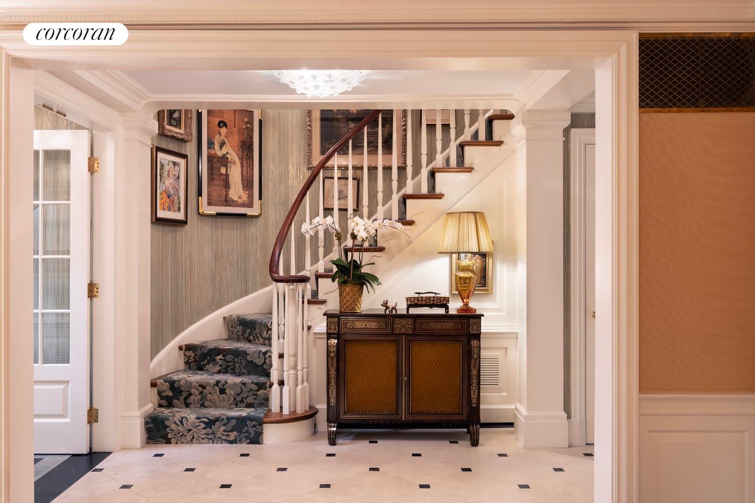 The second floor is anchored by a furnished mezzanine that overlooks the garden level rooms. This flexible space lends itself to dramatic entertaining. On this floor there is also an elegant antique English pine-paneled library with floor-to-ceiling bookcases and a fireplace, as well as a lovely guest bedroom with ensuite bath.