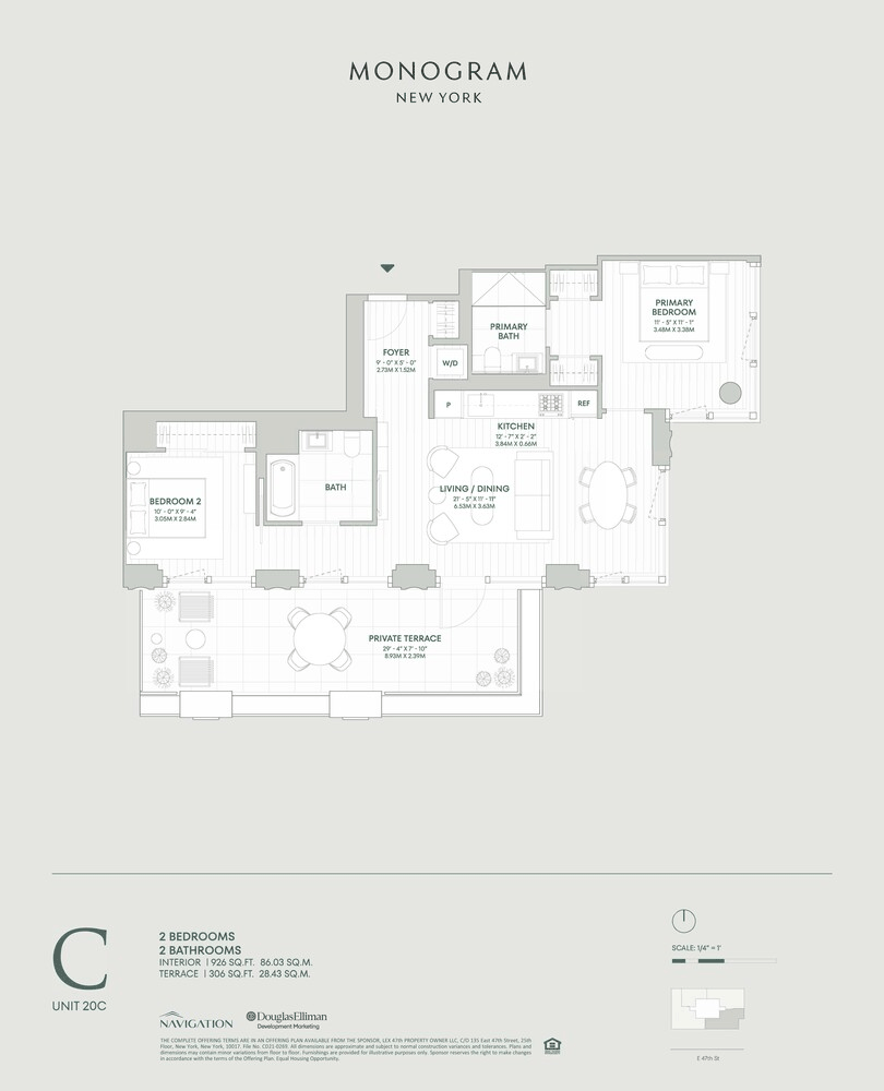 Welcome home to Monogram New York where a life of unparalleled luxury and convenience in the heart of Manhattan's New Midtown awaits you. Residence 20C is an expansive 2 bedroom - 2 bathroom 926 square foot corner home with 306 square foot terrace with East River and Crysler Building views. It features marbled bathrooms, South and East facing exposures, terrific closet space, outstanding light, 10" ceilings, and floor-to-ceiling windows.