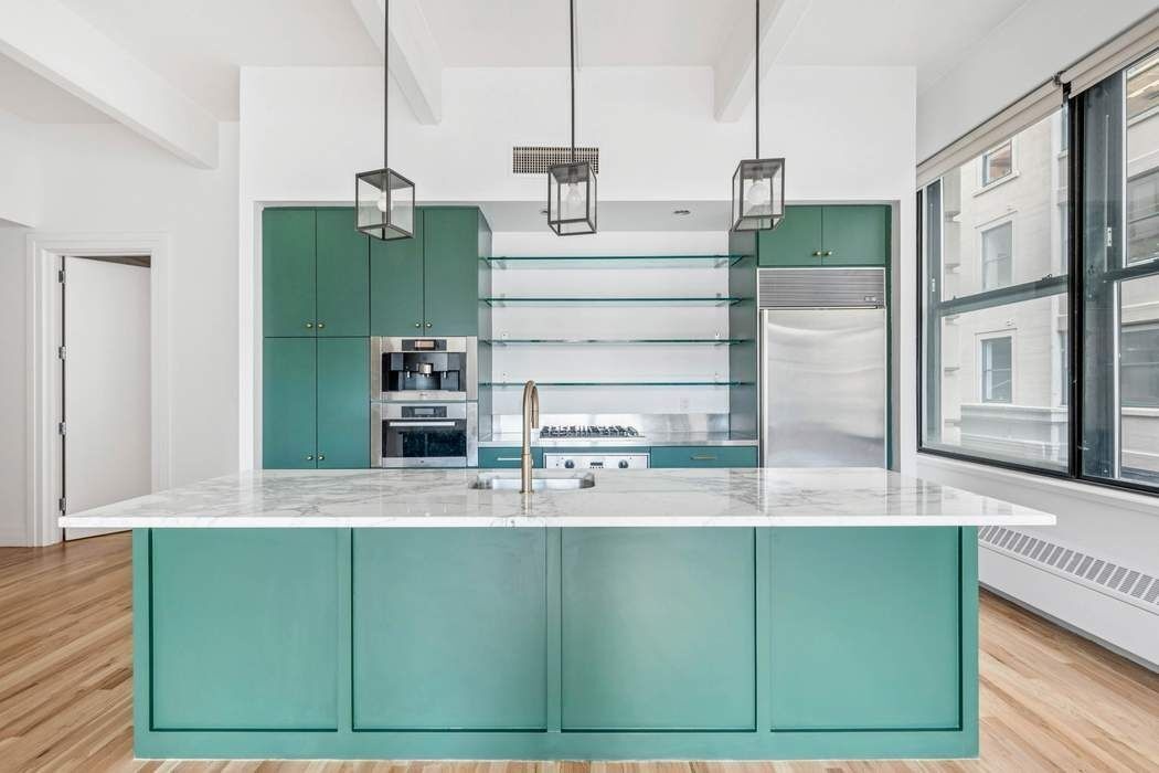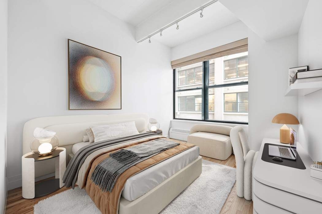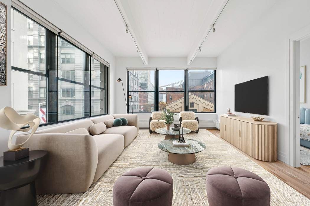 Just off the chef’s kitchen lies the expansive living area. The living room offers a versatile layout that adapts to any lifestyle and provides an ideal setting for intimate gatherings. Expansive oversized windows are equipped with fixed-pane CitiQuiet windows flooding the space with natural light and frame picturesque views of the East River and Brooklyn Bridge Park, capturing the essence of the quintessential DUMBO loft.