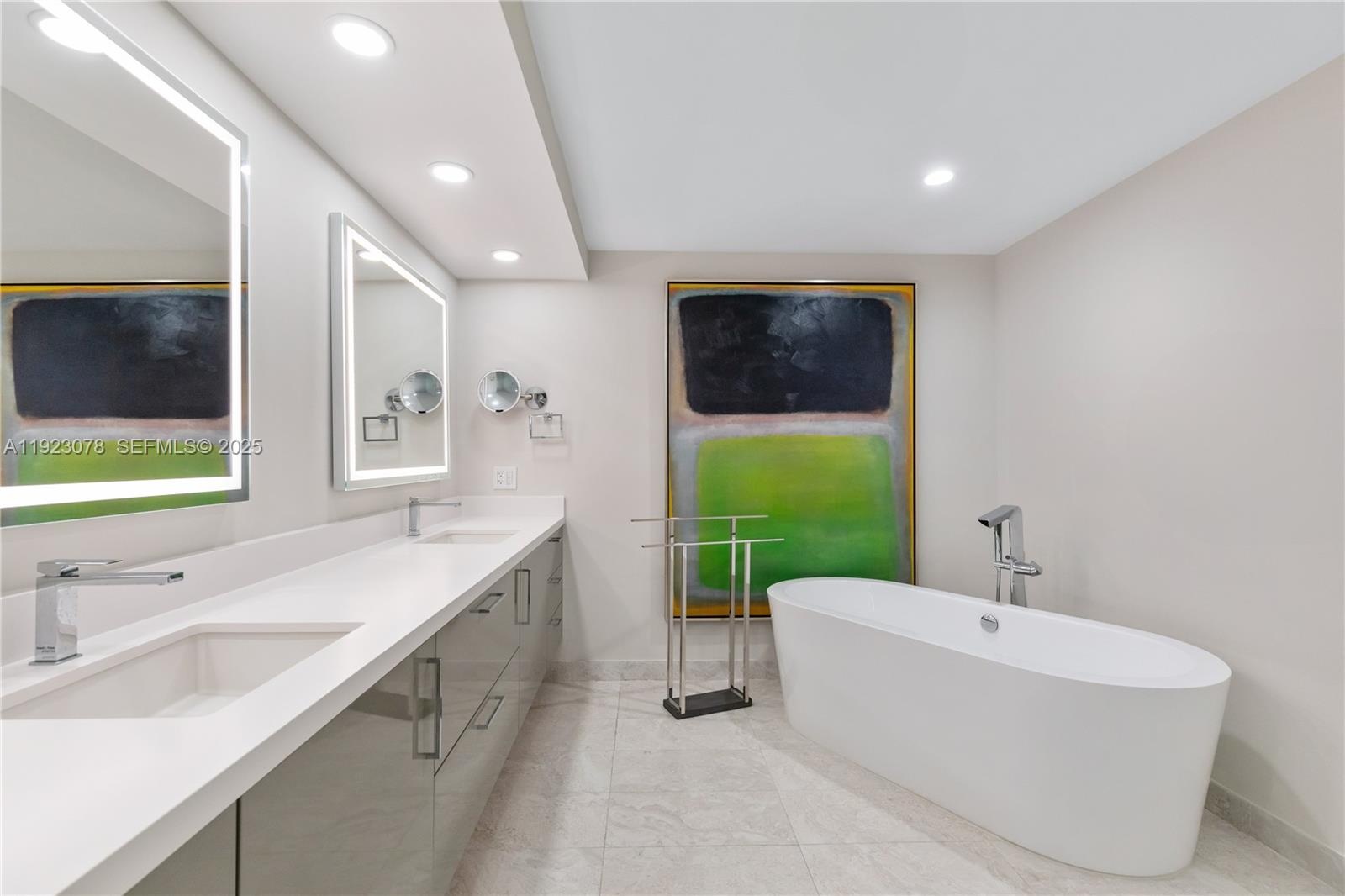 Additional upgrades include Lualdi Italian doors by Piero Lissoni, wired-in electric window treatments, California Closets, and designer lighting throughout. The primary bathroom is a spa-like retreat with a custom vanity, Paris mirrors with integrated LED lighting, and TOTO Neorest toilets. Furnished to the highest level, featuring pieces by Roche Bobois, Minotti, Holly Hunt, and more.