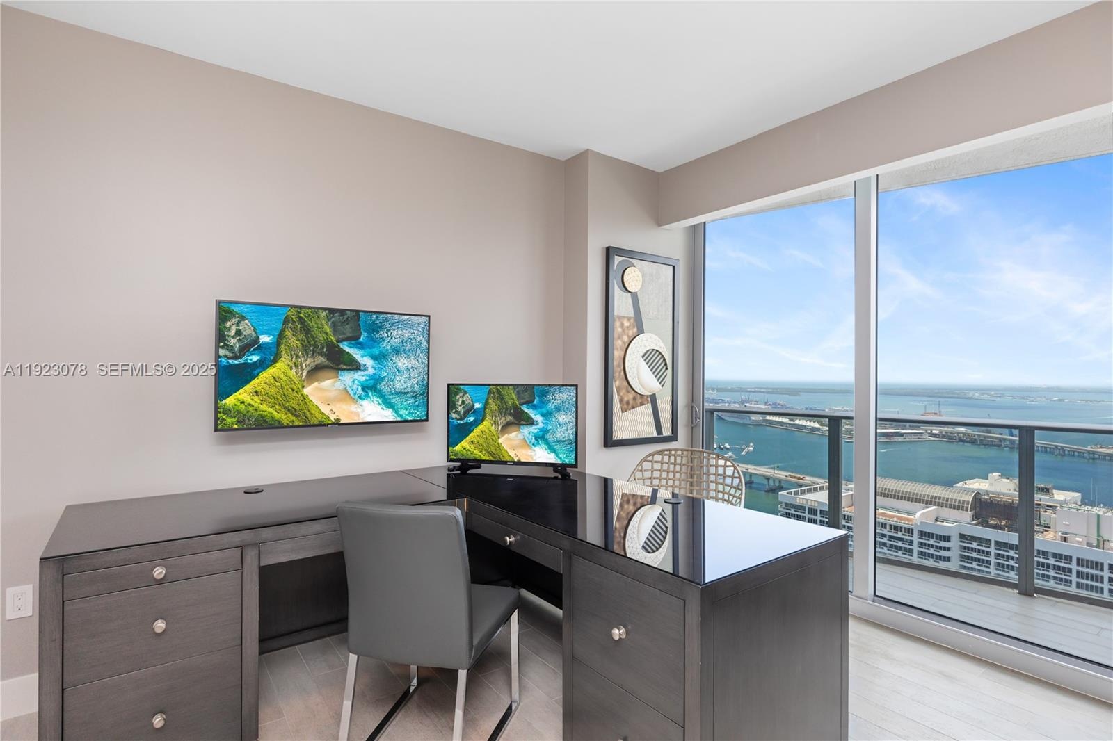 Completely upgraded with unobstructed panoramic views of Biscayne Bay, Miami Beach, Downtown Miami, and the Atlantic Ocean. This exceptional 3-bedroom + den, 4-bath residence features meticulously curated interiors and refined upgrades throughout. Tax Roll Interior: 2,018 Sq Ft (unit measures 2,365 Sq Ft per developer floor plan).