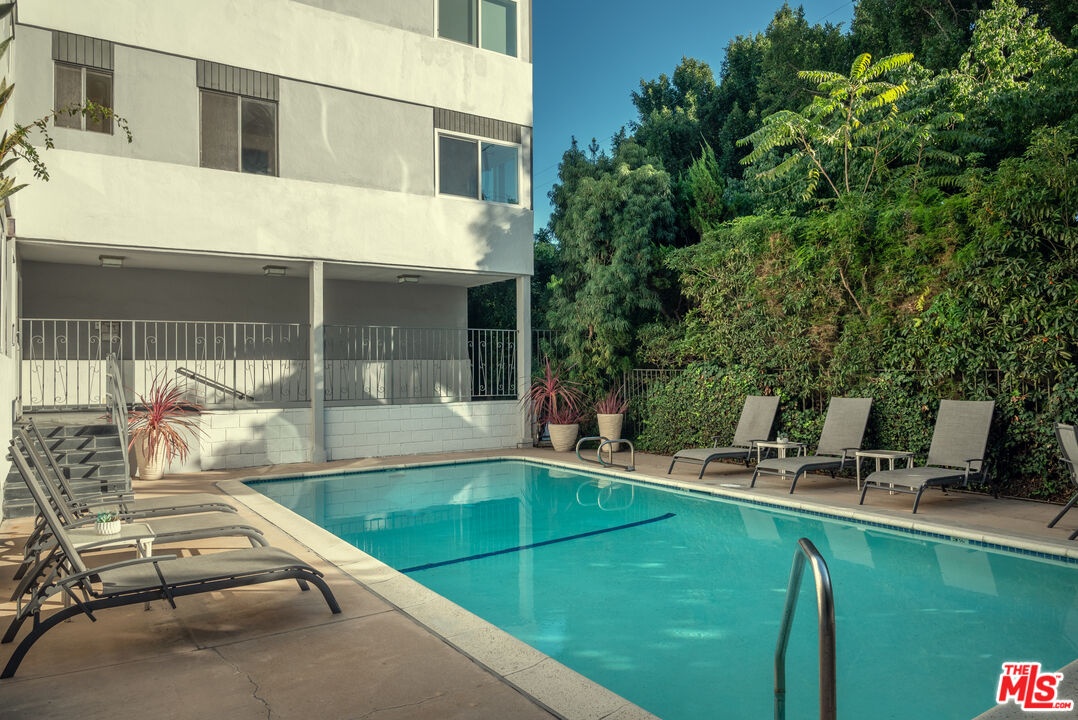 Large flat tucked into a 1965 Mid Century building in the Hollywood Hills next to Runyon Canyon and the Hollywood Bowl. Enter the single story home through double doors to find a galley style remodeled kitchen with quartz countertops and stainless steel appliances that looks out to the formal dining area. Adjacent to that the main living space features a sliding glass door to the large covered balcony that also connects to the primary bedroom. The primary bedroom suite has another glass slider out to this balcony along with its en suite bathroom and fully built out walk-in closet. Past the hallway lined with extra storage closets is the guest bedroom, which features its own sliding glass door and balcony as well. The unit comes with two side-by-side parking spaces in the gated community garage, and community laundry room (in-unit laundry can be added by right with HOA approval). The building features a community pool and hot tub shielded from the street by mature trees and foliage. Incredible location just steps to the entrance of Runyon Canyon and just a short walk to Wattles Park, the Hollywood Bowl, the Magic Castle, the Roosevelt Hotel, and Sunset Boulevard. Also walking distance to grocery stores, restaurants, bars, coffee shops, a metro stop, and around the corner from the Sunset Strip. Rare size with multiple balconies in a smaller building tucked into the tree-lined foothills of Hollywood.