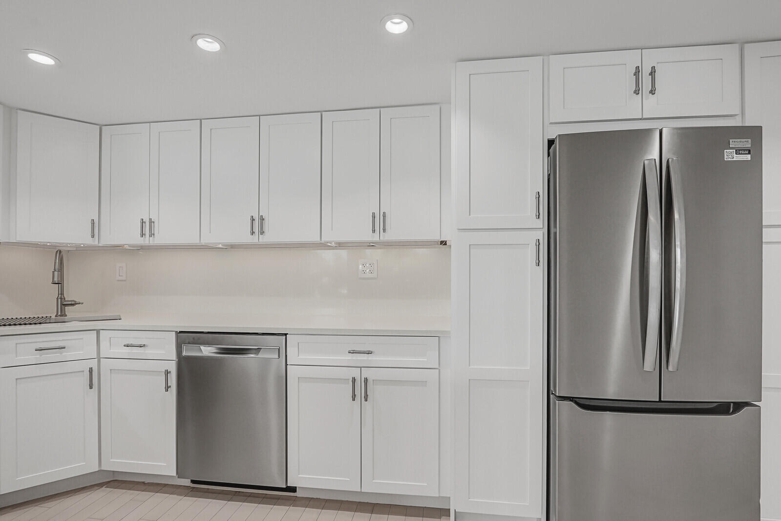 SUPERIOR IN-TOWN LOCATION dictates the desirability of this boutique mid-century with infrastructure improvements of new roof, new east and west facing roof decks, new lobby and hallways and public spaces. FRESH FRESH FRESH top to bottom!!Unit #3F is a third floor 2 bedroom, 2 bath unit located on the sunny and breezy NE corner with a full wraparound balcony overlooking the exquisite lush estate properties of adjacent Dunbar Road. This unit has been FULLY renovated with a gorgeous new open kitchen, brand new stainless appliances, updated baths, smooth ceilings and full impact glass. It's READY TO GO! This unit has enjoyed an exceptional rental history and 223 Atlantic offers IMMEDIATE availability for rental following sale with TWO rentals per year. Excellent mixed use possibilities!