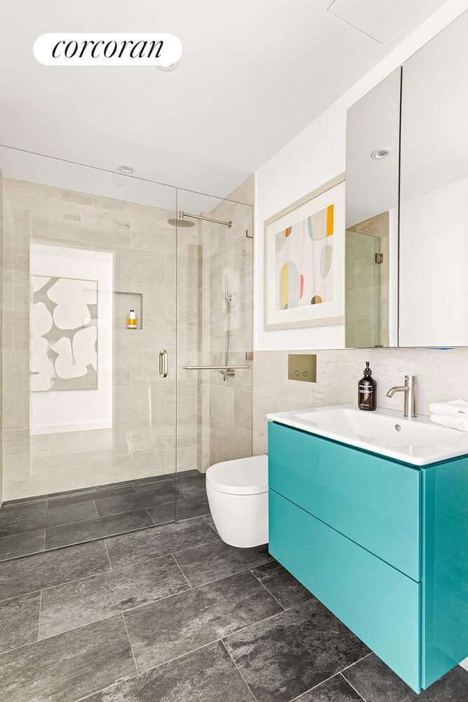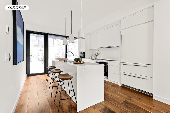 The lowest floor offers flexibility and function: laundry, an additional powder room, extensive built-in storage, and access to a sunken court. Sound attenuation mats under each floor preserve a sense of quietude throughout the triplex.