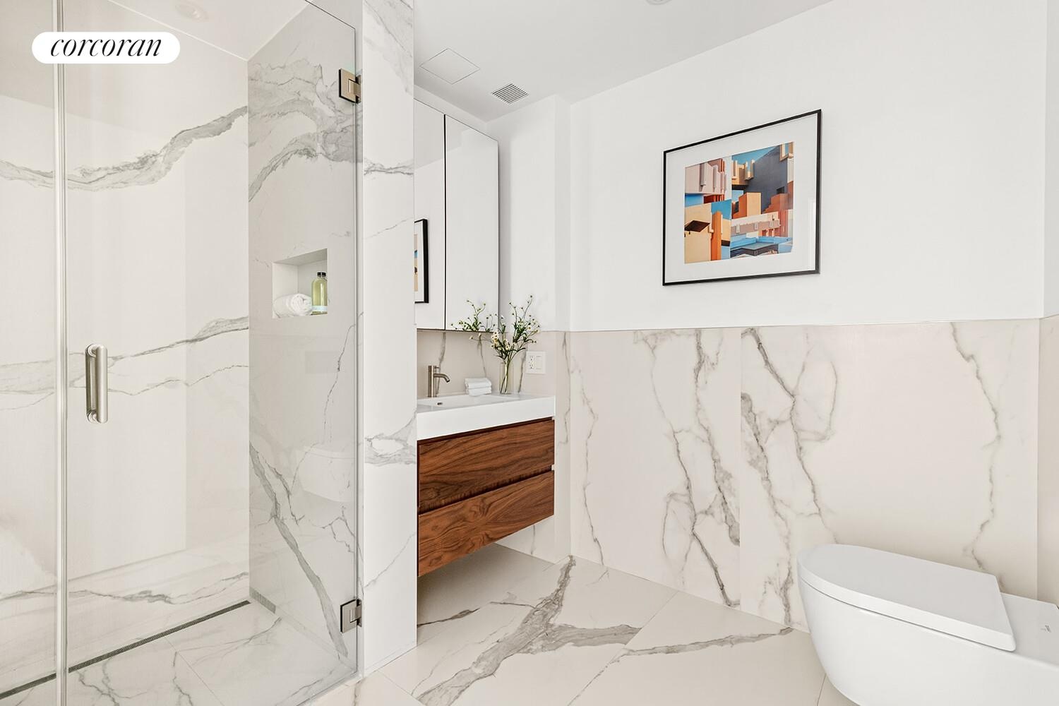 One level below, the primary suite is a tranquil retreat carved into the rear of the residence, defined by privacy, soft light, and two interior courts. The bath feels spa-like and architectural, with radiant-heated marbled Italian Florim slabs, a freestanding soaking tub, and a floating walnut-accented double vanity.